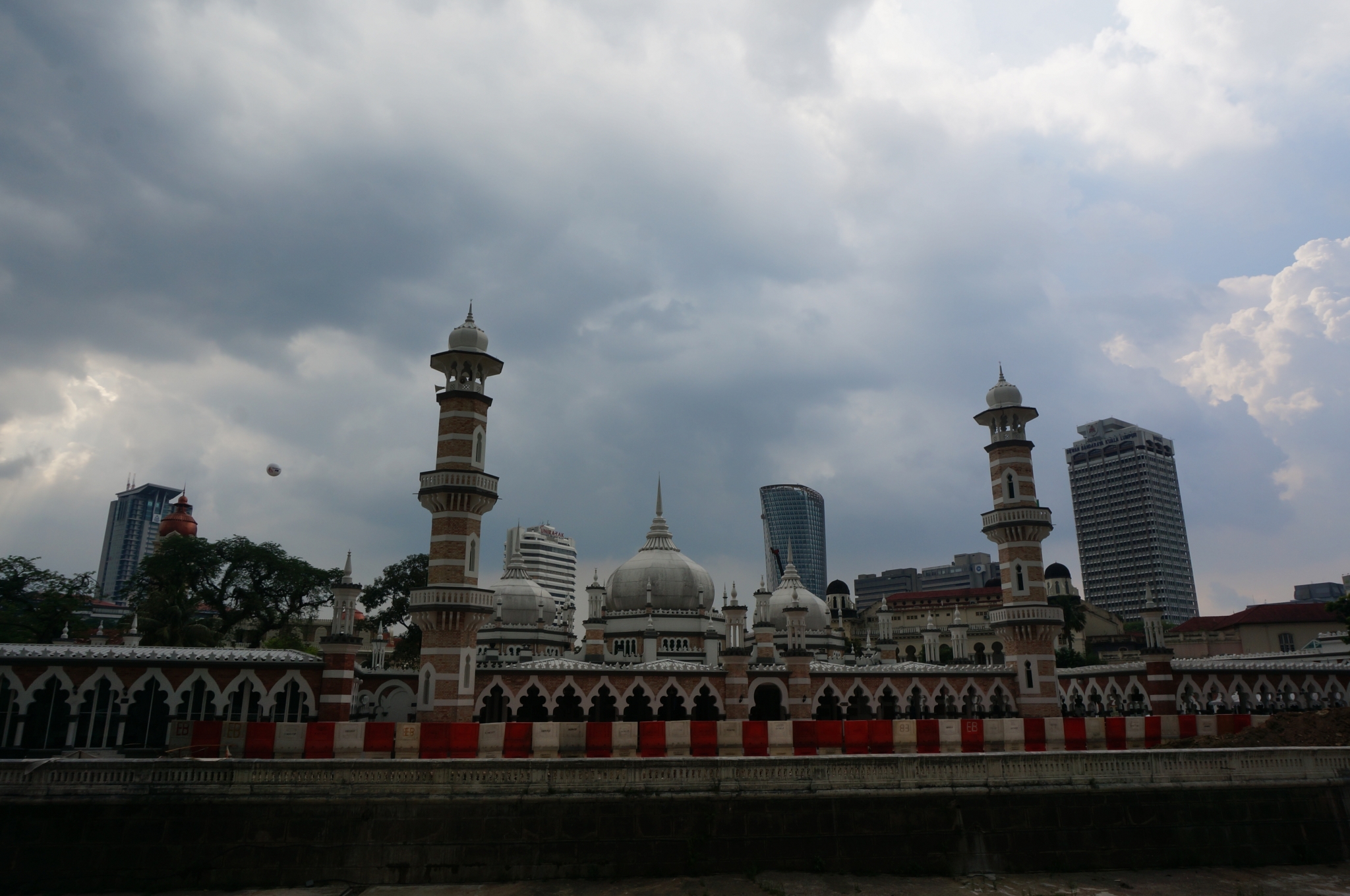 饭后我们乘坐地铁从KLCC去到Masjid Jamek,游览嘉美克清真寺。谁知已经过了开放时间。想要进去观赏需要注意的是,除了男士,清真寺只允许带头纱的女士进入。所以我们只好站在外面远观嘉美克清真寺。衬着浓云密布的天空,整个清真寺看起来神圣,壮观。