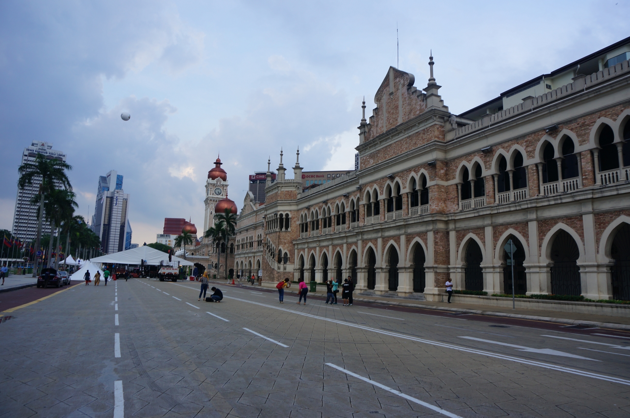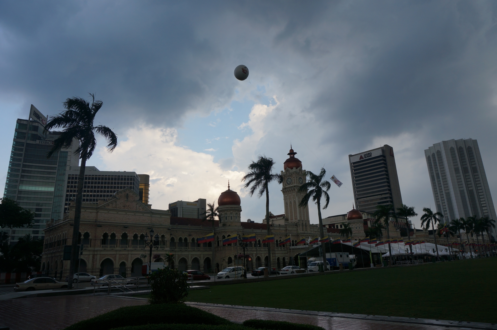 之后,步行去往独立广场(Merdeka Square)。刚到达双脚还没触及广阔的草坪时,来了一场阵雨(据说吉隆坡时不时就会下场大雨,虽然前一刻还是晴空骄阳,出门在外记得带伞呐)。雨停了之后,走过草坪,旁边是建筑风格很有特色的苏丹阿都沙末大厦(Sultan Abdul Samad Buildind), 恍惚欧洲街道的感觉。