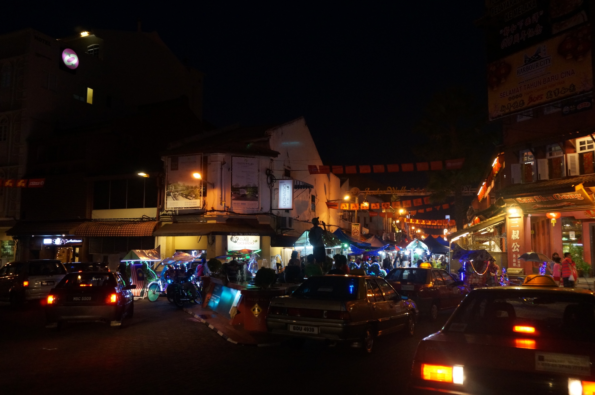 Check in后让前台小哥帮我们叫了晚上7点的Taxi, 打算稍作休息后去鸡场街(Jonker Street)觅食。在前台一般都有免费的地图和景点美食介绍的小册子,有些Hotel没有摆出来可以问前台要一下。事实证明,这些资料是灰常灰常有用的,我们晚餐就是去了“马六甲景点美食介绍”的小册子上推荐的一家位于鸡场街附近的“峇峇娘惹餐”餐馆(在三叔公隔壁的隔壁),四个人吃得很满足才花了97RM,强烈推荐辣椒鱼!为了隐藏游客属性,我就没有端起相机对着食物各个角度拍照了...饭后走进鸡场街,街两边是一些卖纪念品和小食的摊位小店,说好玩吧也还行,就是走走看看,帮助饭后消化。关于特色小吃就没怎么有印象。所以说,不应该幻想街两边都是各种诱人小吃啊