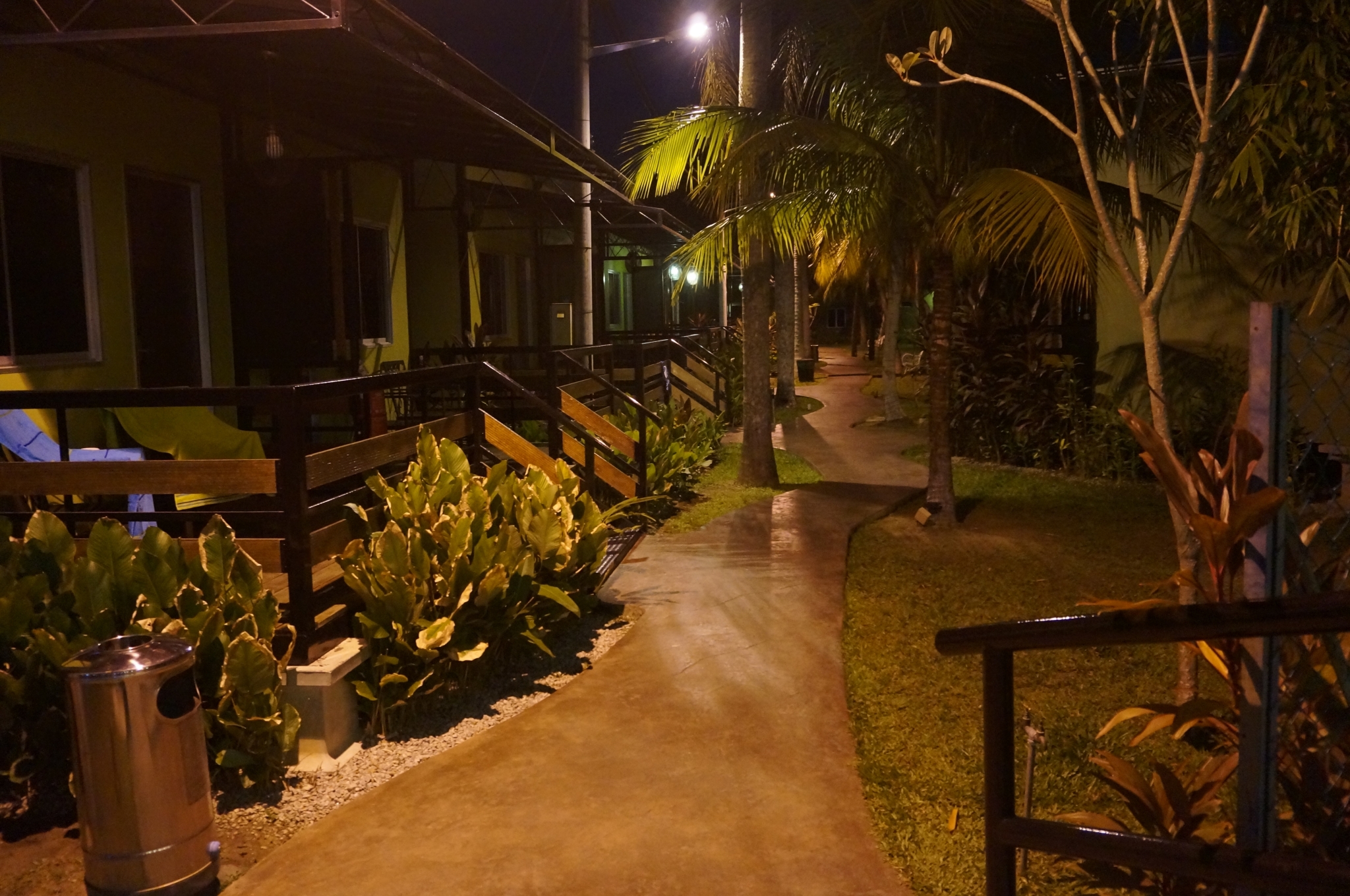 一小时的飞行,飞机落地滑行,从窗外看出去,兰卡威就像个静谧的荒岛,机场周边是看不到边际的果林,三两点灯火外,全是漆黑的夜。机场很小,小到从进口一眼就望到了出口。这给我一种踏实的感觉,可能由此觉得这个地方有我想要感受的那种偏僻和安静,人应该不会太多。机场内购买了出租车票,门外就是候车区,很快我们就被安排到一辆崭新的九座出租车,够宽敞,够舒适,LL同学已经激动地拿出手机各个角度拍照了...驶过一路荒芜,到达所谓的Downtown中心区才看到了集中的烟火灯光,两边开始出现一些餐馆和商店。我们订的Hotel是珍南沙滩附近的Casa Fina Homes Hotel, 双人间每晚310人民币左右,岛上的住宿比马六甲贵。这里的房间外观看起来像是一件件独立的小宅,门外有圆桌座椅,有木质围栏,围栏旁边是一簇簇的开花植物,又是满满的度假Feel