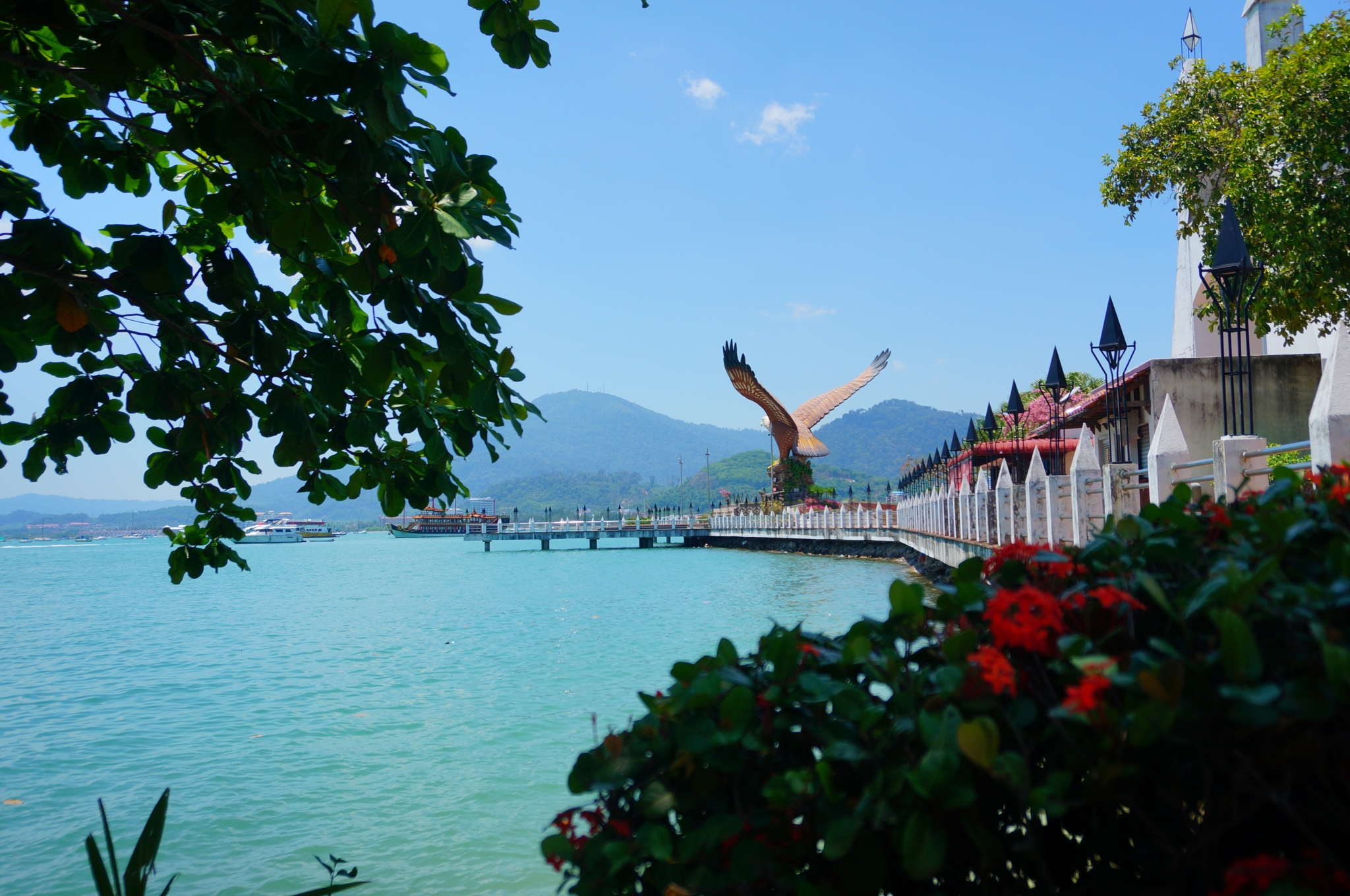 从天空之桥到观景台,这回程就是对抗地球引力做功了,原生态山路和石阶,加上东南亚的炎热,送你一个汗流浃背腿麻脚酸。还好刚冒上观景台地面,就有卖椰子和冰水的小摊,7RM一个椰子,先咕嘟咕嘟解个渴回个神再坐缆车下山。出去后找Taxi,发现载我们来的那的司机大哥还在,那一刻竟然感到惊喜和感动,他居然一直在那里等我们,虽然可能是我们想多了...花费了46RM从天空之桥去到瓜镇买9号去往槟城的船票,一般船票都挺紧张的,特别是旺季,所以最好提前购买。买完船票去附近的美食广场吃了午饭,有很多家档口可以选择,带上饮料四个人一共才花了39.2RM。因为离泰国普吉岛特别近,这里的泰国料理都还蛮正宗的。饭后走去了咫尺之外的巨鹰广场。虽说大家一直叫嚣这个老鹰地标太Su太Su了, 但遥看巨鹰朝着大海的方向展翅起飞,也不失特色。下午两三点的骄阳,撑着伞走过都觉得要被烤晕了。巨鹰广场前匆匆拍了张合照就打道回府了,从瓜镇到Hotel坐Taxi是30RM。这匆匆一拍的合照果然是不忍直视,做事还是要稍安勿躁急不得啊