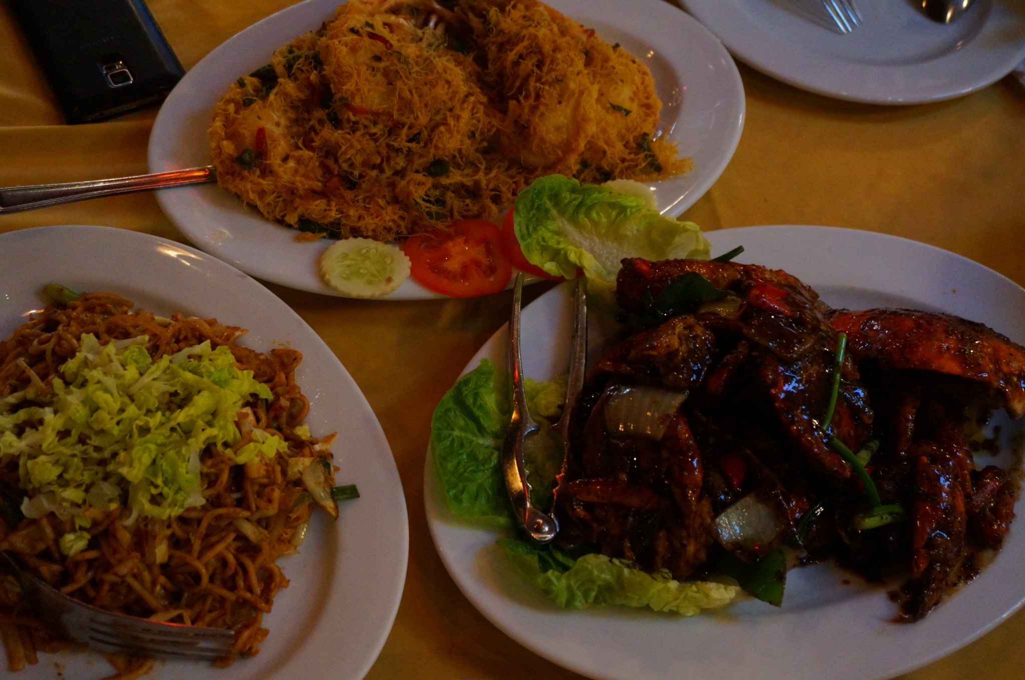 这个时候的Pantai Cenang街区也是人迹寥寥,服装店的大姐阿姨们都趴桌上睡着了。这个点儿还是呆在室内吹着空调休息比较明智,我们也就明智地一直休息到晚上6点才出街直奔海鲜大餐。如同马六甲的五星Hotel, 这顿海鲜大餐也是我们一路盼着的。去了真浪花园海鲜餐厅(Orkid Ria Seadfood Restaurant),点了奶油虎虾,清蒸石斑鱼,黑胡椒蟹,鱼翅香菇汤,炒饭,炒面,和辣炒空心菜,还有鲜榨果汁。吃得太满足啦
