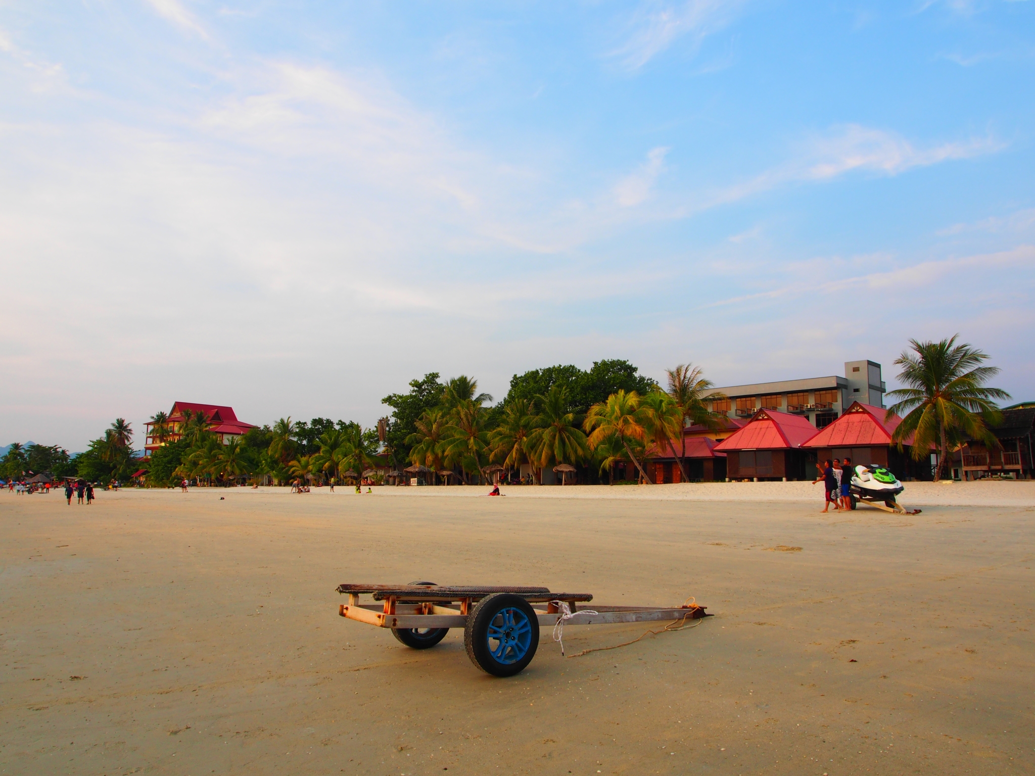 虽然进到房间里会发觉这种小宅子的本质可能是活动板房...好吧,整体还是挺满意哒。放好行李稍作休息我们就出街了,能逛的就是Hotel前的一条主街(应该叫Pantai Cenang),话说在兰卡威的两天三晚,这条街我们四人来来回回不知走了多少遍,连哪里有个下水道井盖都记得了。在附近的AB Motel定了8号早上的跳岛游,据说是全岛最低价25RM每人(开口要价30RM,记得杀价~)。