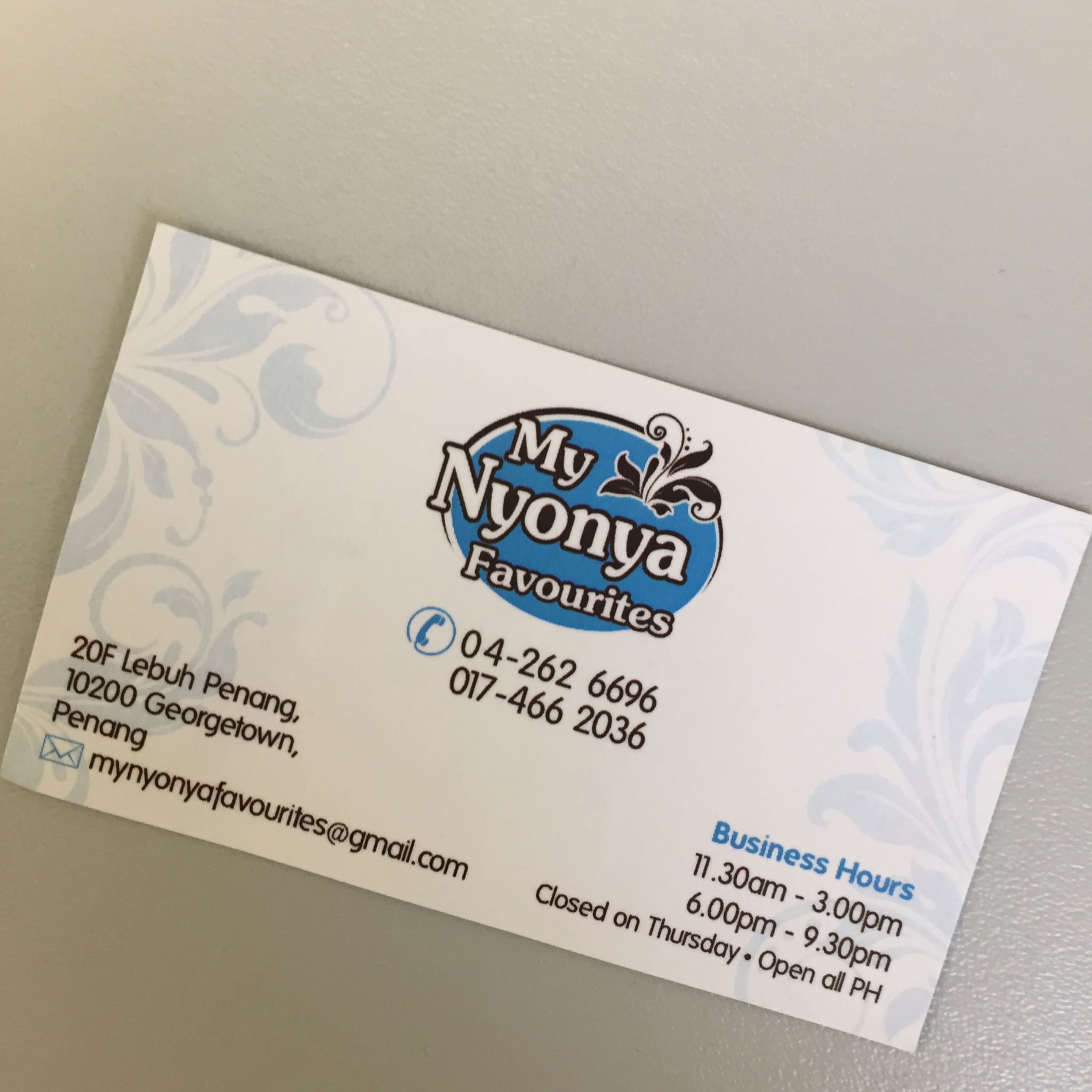 走到娘惹菜馆门口,离6点还有半个多钟头,时间啊我该如何打发你?忘了是谁怂恿大家走进了一家台湾小食店(估计此人不是LL同学就是ZZ同学),于是又点了喝的和小食,在此店坐等隔壁店营业。为了彰显矜持,LL同学号召大家6点5分再过去娘惹菜馆。拿着菜单点了所有的主厨推荐,还有槟城特有的豆蔻水,太...好...吃...啦,也不算贵,四个人花了120RM左右~这家店生意挺火的,都坐满客了,想着要写功略,结账时特意拿了张名片,如图所示,强烈推荐哦~