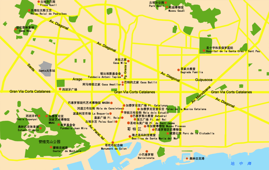 5/1下午正式开始西班牙之行,先上张巴塞罗那地铁图和景点分布图给大家参考。