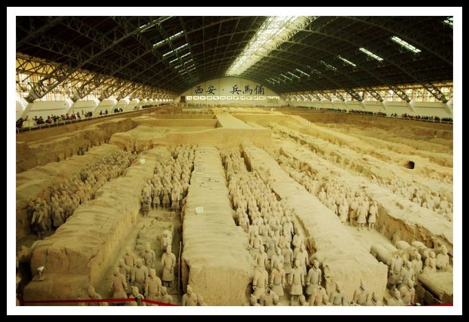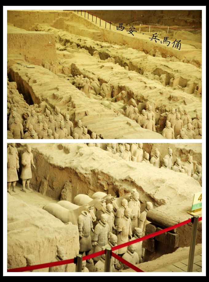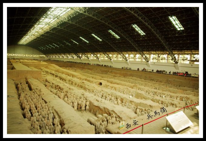 秦始皇陵兵马俑位于陕西省西安市以东35公里的临潼区秦始皇陵兵马俑陪葬坑内,于公元前246年至公元前208年修建。现已发现和真人、真马大小相似的陶俑、陶马近8000件。有车兵、骑兵和步兵等不同的兵种,排列整齐有序。陶俑的形象各不相同,被誉为“世界第八大奇迹”、“二十世纪考古史上的伟大发现之一”。