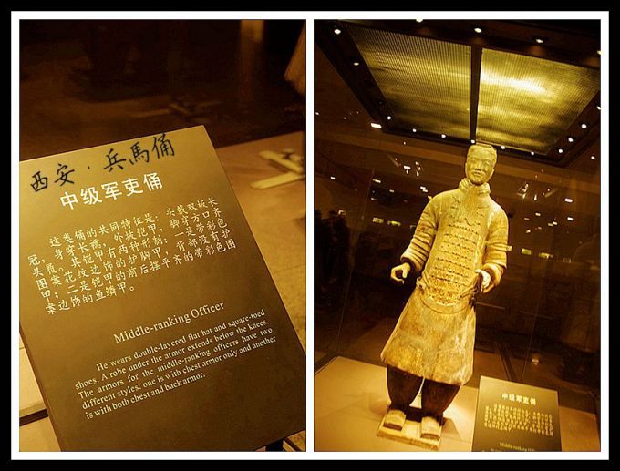 军吏俑,从身份上讲低于将军俑,有中级、下级之分。从外形上看,头戴双版长冠或单版长冠,身穿的甲衣有几种不同的形式。军吏俑除了服饰上与将军俑不同外,精神气度上也略有差异,军吏俑的身材一般不如将军俑体魄丰满魁伟,但整体上比较高大,双肩宽阔,挺胸伫立,神态肃穆。更多的表现出他们勤于思考,勇武干练的一面。