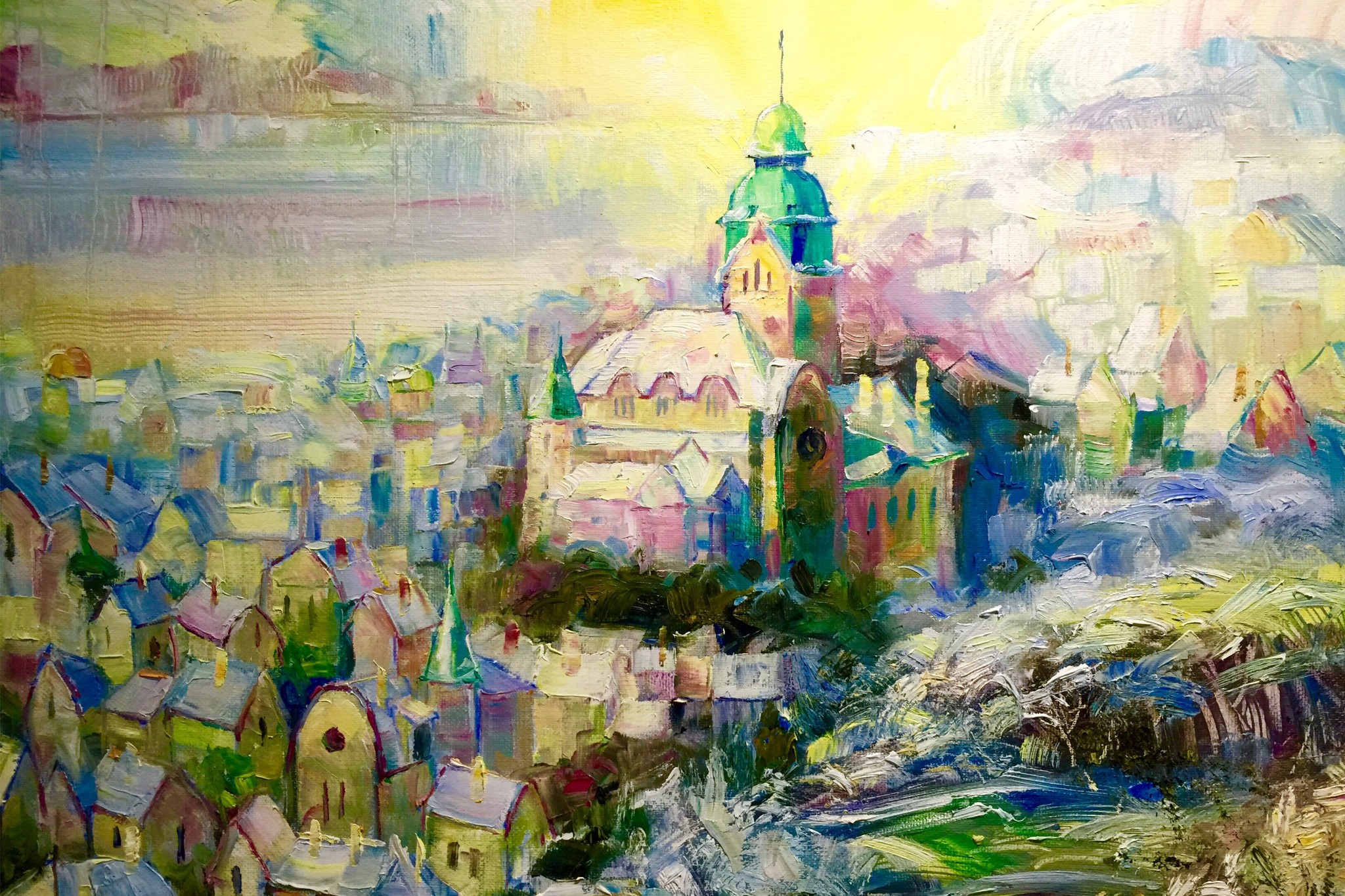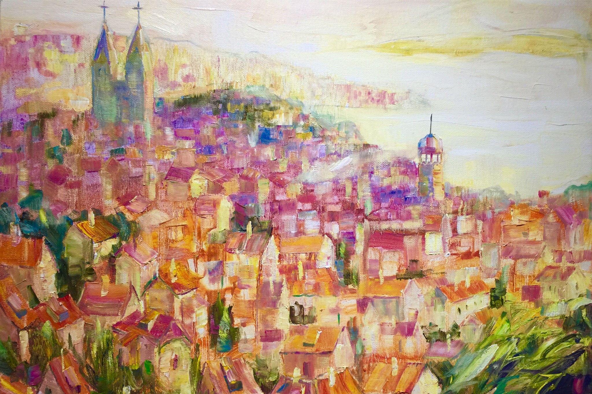 画布上的青岛正如它本身一样色艳浓郁,红色房顶的老建筑代表着这座城市曾经的历史。