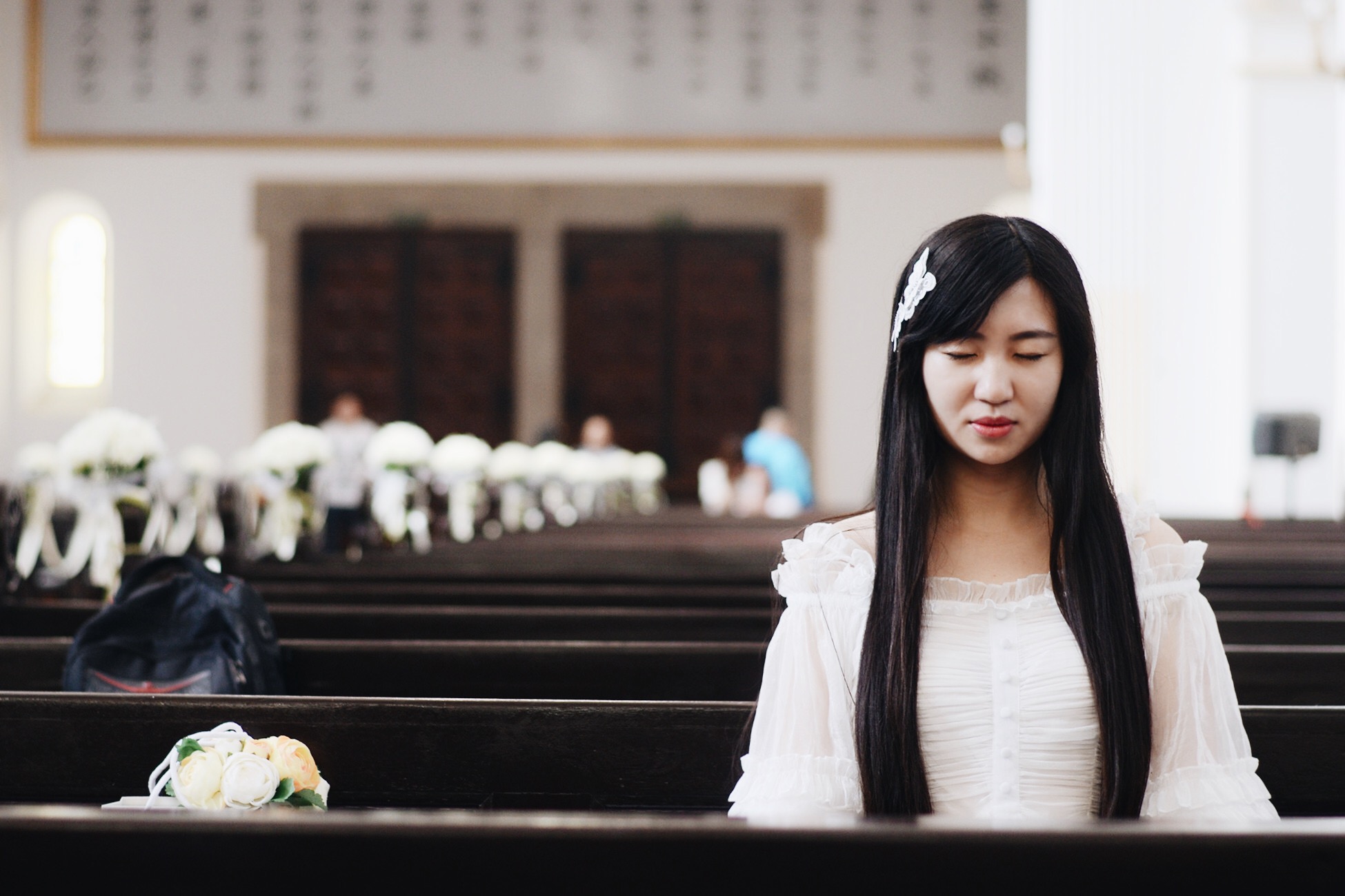 我总觉得在教堂里穿简单的白色就很好看,本来我想带头纱,被大湿嫌弃了,然后我说在教堂门口支个脚架,又被大湿嫌弃了......在教堂里好不容易人家把相机放在前排的桌子上拿快门线按了两张。