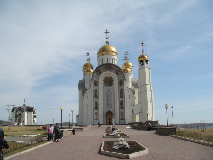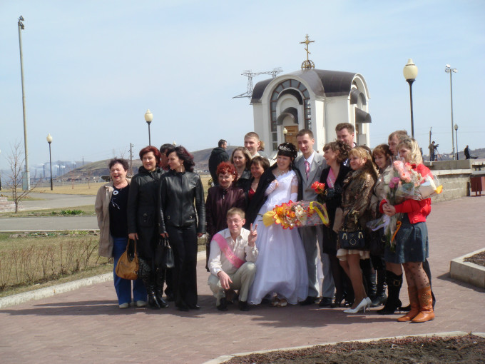 休息日我们去逛街,在街道、市场、商店转一转,买点儿日用品,像蔬菜、面包、饼干、啤酒等食品;因为在这里待的时间不长,又怕吃不来俄式伙食,我们都自带了些面条、调料等常用物品,自己起伙,做些简单的饭菜。这里的厨房用具全部用电,像电烤箱、电水壶、电饭锅等等,和我们差不多,就是这些家用电器都挺落后的,有点像老古董。我们在闲暇时游览了市容(因为不懂俄语,也不敢坐公交车,就是走哪儿算哪儿,原路回来),途中,游览了烈士公园,挺肃静的,公园雕塑前的长明灯几十年就这么燃烧着,没有熄灭过(我们问过马钢的人)。途中看到了到金碧辉煌的大教堂,高大、精美,正好碰到一支结婚的队伍,我们很友善的打了招呼,送上祝福。尽管语言不通,但是连比带划地把意思表达清楚了,他们也很高兴,直说“斯巴西巴,斯巴西巴(谢谢)。他们还允许我们拍了他们的全家福照片。