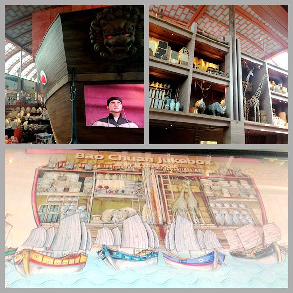 一进海洋馆就看到一艘大船,船头是一个大狮子脸和短片,当它眼睛发红发亮,短片就开始循环播放,是《郑和下西洋》!船尾是一个横切面的柜子,可以看到船的内部结构。里面都是郑和当年下西洋交换回来的东西,包括一些珍贵的动物(比如长颈鹿和犀牛