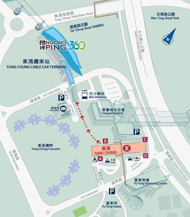 交通:港铁:在尖沙咀坐地铁荃湾线到荔景转东涌线到终点东涌或者在尖东站坐西铁到南昌站,转东涌线到东涌站,由东涌港铁站B出口只需步行2分钟便到达东涌缆车站。一出地铁站就可以看到东荟城,往左边走就可以到坐缆车的地方了。巴士:顺东路巴士站(香港岛:E11,九龙:E21,E22,E23,新界:E31,E32,E33,E34,E41,E42,假日乘撘新大屿山巴士1R往来红磡及昂坪)。