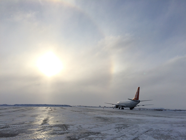 11月8日,早上7点过从酒店出发,酒店就在候机楼停车场,但是我们是乘包机,所以没有走候机楼,在坐车去停在机场角落的飞机的路上,偶遇气势磅礴的日出,漫天的彩霞!遗憾的是相机放在行李箱里!等下车上飞机的时候,彩霞已经褪去了好多。不过我还是抓住了一点尾巴,这雨后突然的放晴,预示着我的北极熊之旅开头运气不错!