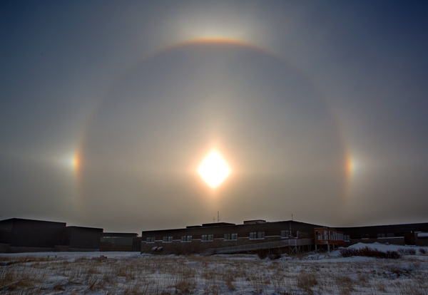 不过万能的朋友圈很快告诉我,那不是彩虹,是日晕,日晕是一种大气光学现象,是日光通过卷云层时,受到冰晶折射或反射形成的。天空中有冰晶组成的卷云时,往往在太阳周围出现一个或者两个以上以太阳为中心,内红外紫的彩色光环,有时还会出现很多的彩色或者白色的光点和光弧,这些光环、光点和光弧统称为光晕。哈哈,我也学习了。