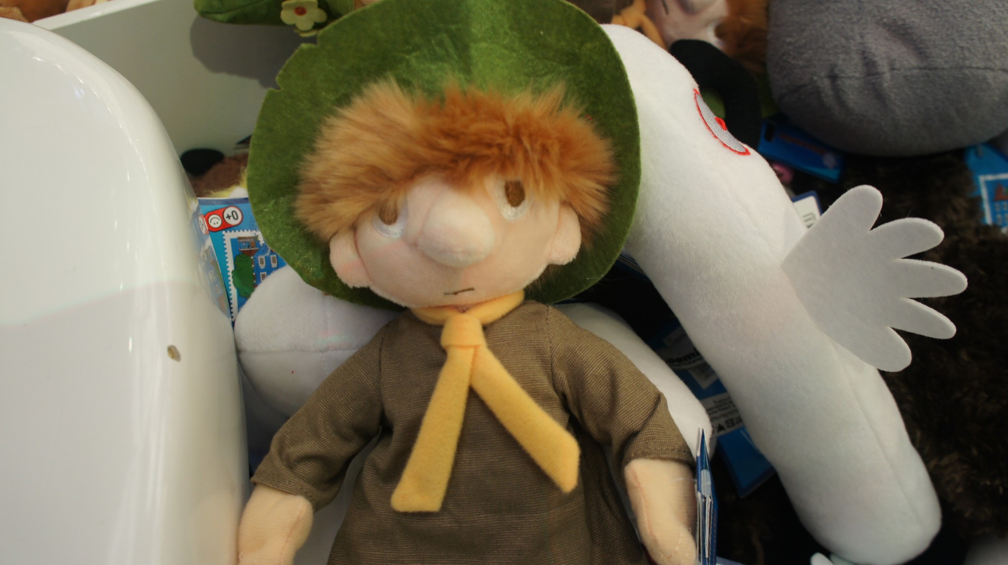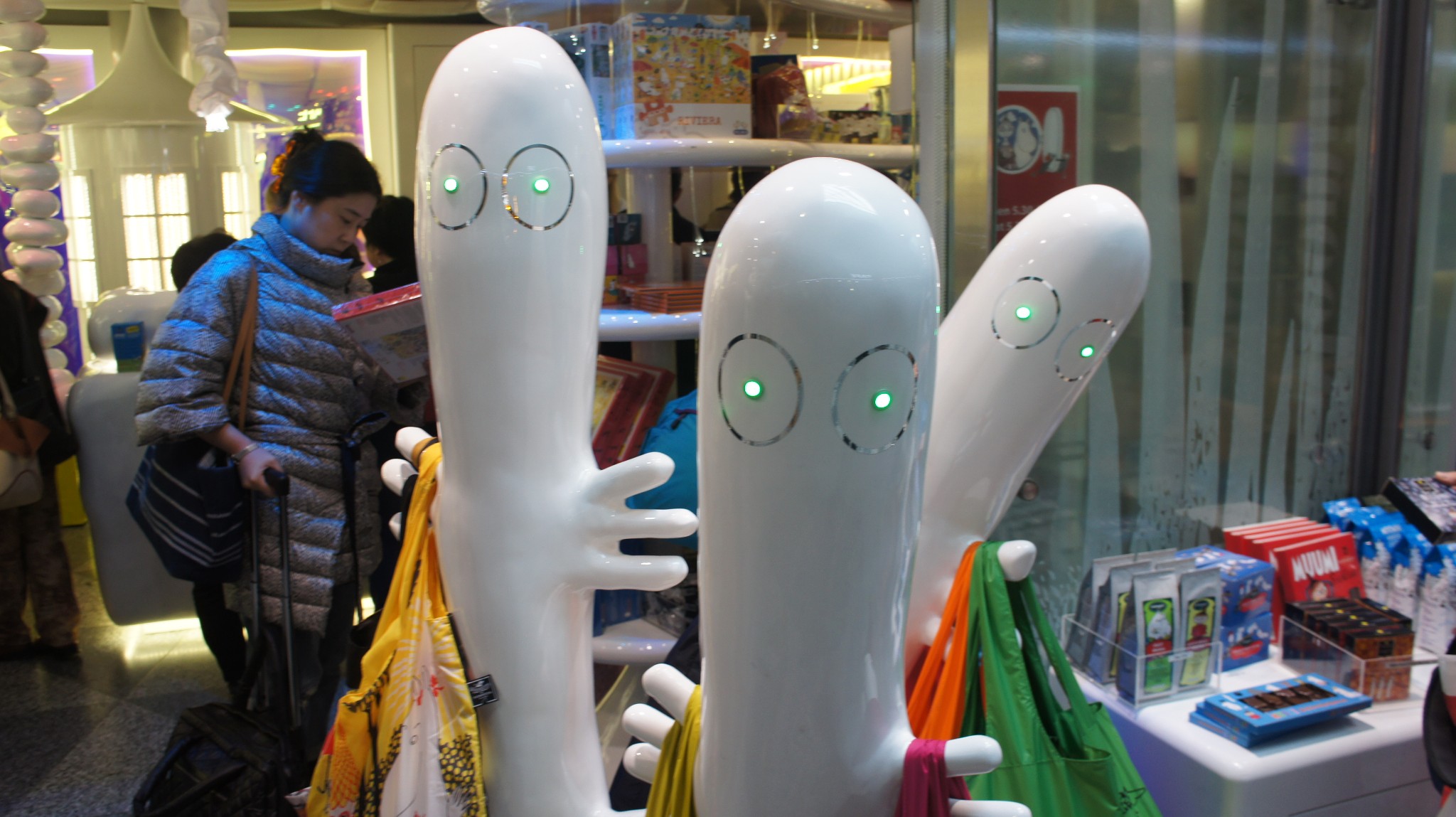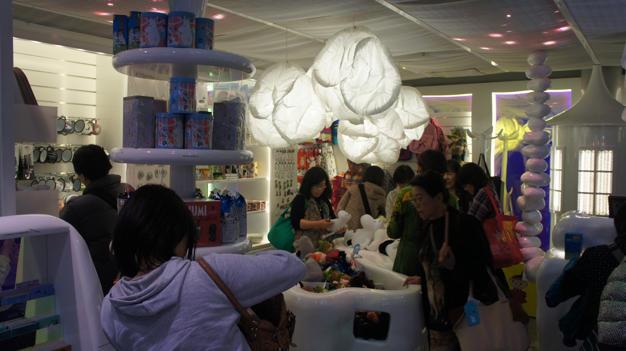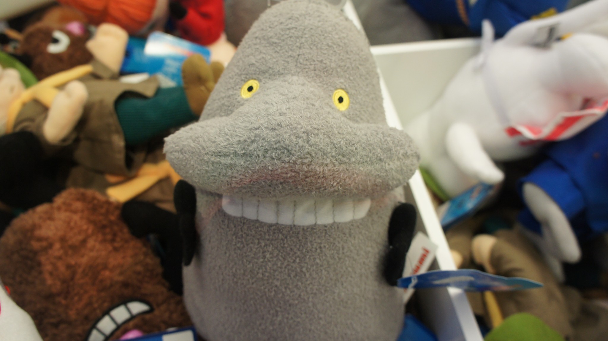 赫尔辛基机场不大,人来人往的,倒也十分热闹,一条短短的走道两旁分布着不少店家,出售着各种不同的商品,有家卖旅游用品的商店,生意似乎特别好,挤着不少的人。走进去看,果然有着造型怪异,平时很少见长毛绒玩具。
