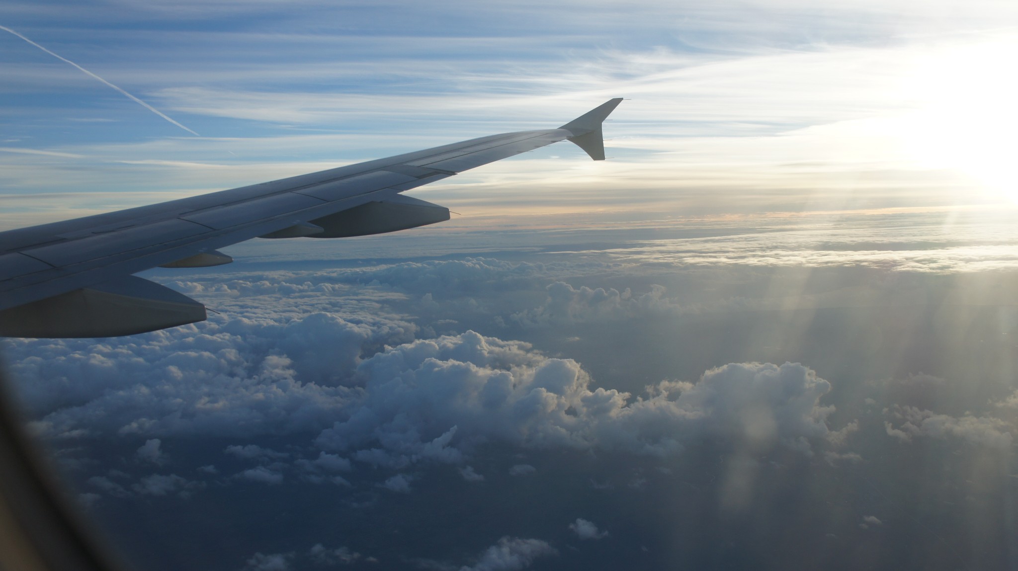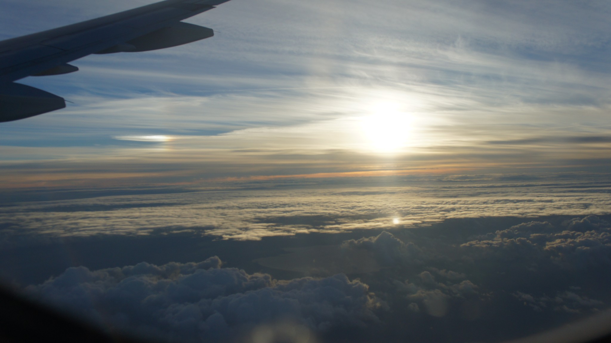 等待中,透过玻璃,我们看到外面的天空,一点点晴朗起来了,又过了一会,在厚厚的云层间,居然出现了些微美丽的晚霞。我们就是在这样一片充满希望的夕阳中,再次登上飞机,飞往我心目中的圣地,丹麦哥本哈根,前往新港。