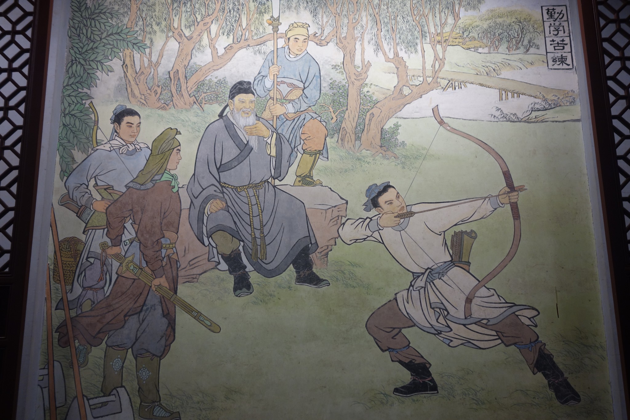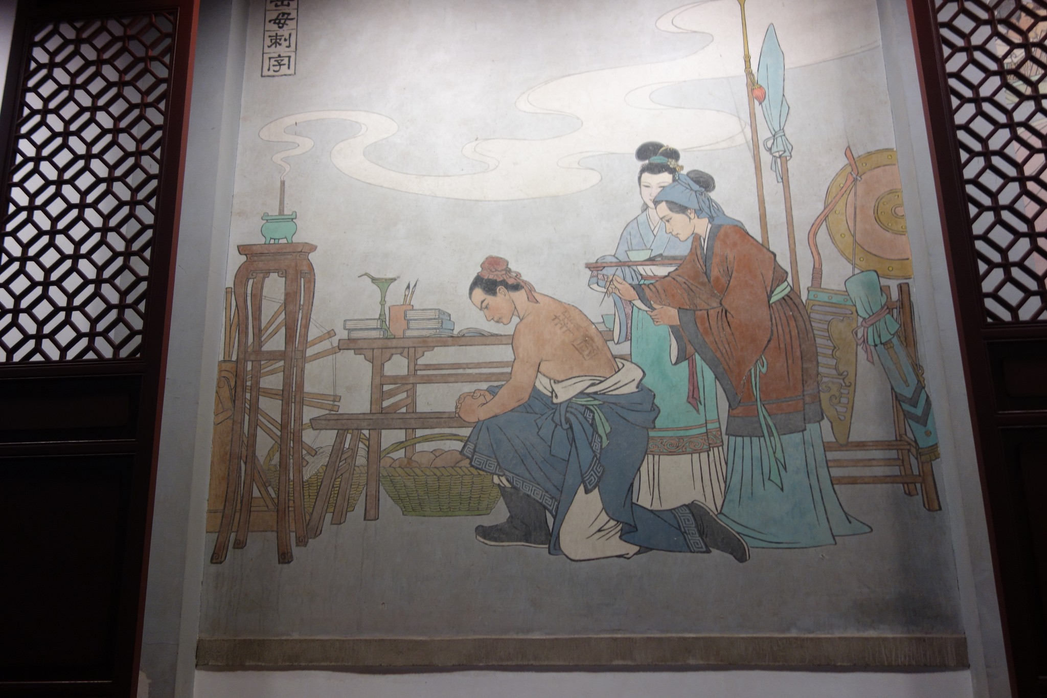 上面几个大字是:还我河山。足以见得岳元帅一生的追求,庙里墙壁上有很多壁画,讲述了岳飞从小学习武艺,岳母刺字,率军攻打敌寇,到最后被奸人所害的遭遇。认真看了,有所触动。