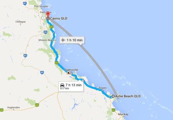 如果是从布里斯班自驾去Airlie Beach,路程不到1200公里,连续车程需要大概12个半小时。如果再加上中间休息、看看风景和吃饭的话,一天太紧张了,所以最好放两天时间会比较从容并且有利于行车安全。如果中途留宿,建议住在Rockhampton。从布里斯班到Rockhampton大概640公里,车程约7个小时。然后第二天从Rochhampton开到Airlie Beach是不到500公里,车程大约5个小时。