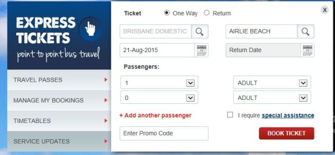 选择上述的点对点车票项目后,就会进入下面的购票页面。首先选择是单程还是往返,然后输入出发地、目的地、出发时间、返程时间(如果是购买往返车票的话)和乘客数和乘客类型(下拉箭头可以选择成人、有陪伴儿童3-14岁、无陪伴儿童12-14岁、2岁以内幼儿等)。另外如果需要特殊协助要勾选“Special assistance”选项。最后点击“Book Ticket”的按钮。