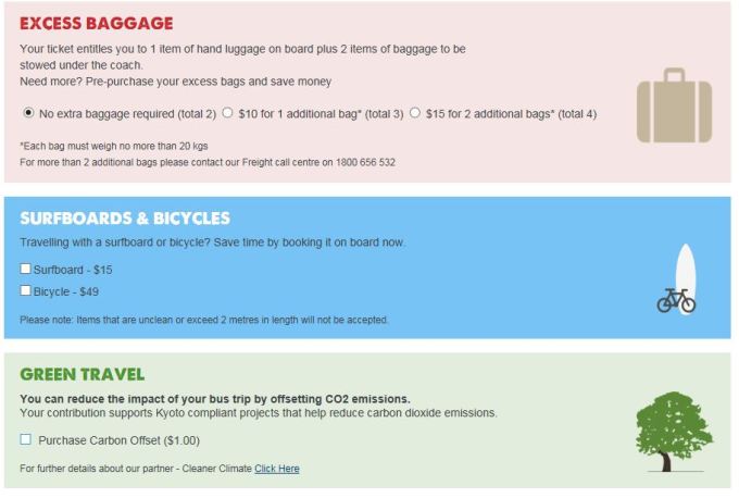 另外如果有自行车或者冲浪板要托运的,需要在蓝色框里选择添加的,冲浪板要15澳币,自行车要49澳币。