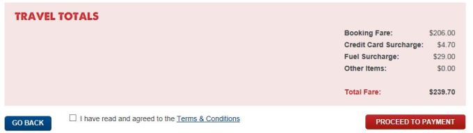 在进行完上述额外行李、自行车、冲浪板或者环保赞助的额外选项后,最后显示的就是下面的票价总额。确认无误后,勾选”I have read and agreed to the terms & conditions”前面的方框,最后点击“Proceed to Payment"的红色按钮,网页就会把你带到支付页面。选择信用卡支付是最方便的,不过会收取2%的信用卡手续费的。最后支付完毕后就会把电子票发到你指定的邮箱啦。