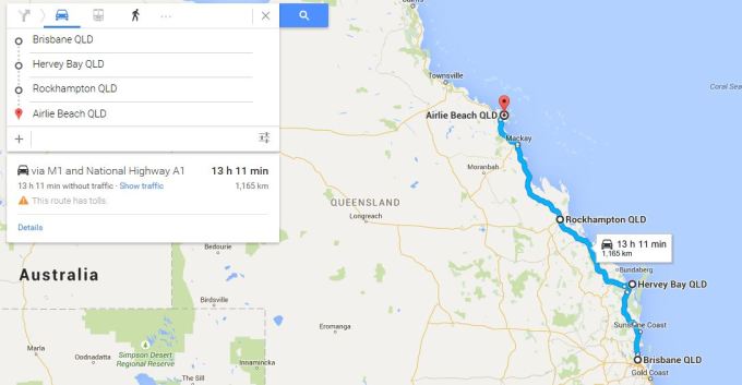Google地图截图显示的从布里斯班自驾到Hervey Bay,然后从Hervey Bay到Rockhampton,再从Rockhampton到Airlie Beach的路线。