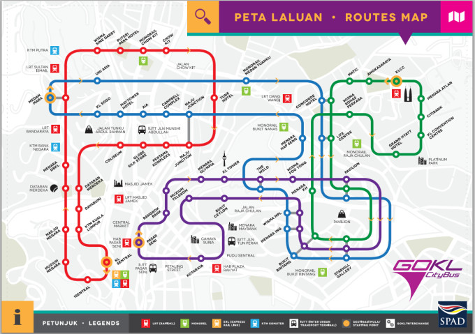 吉隆坡的公共交通除了轨道,还有BUS,GOKL巴士从2014年更改了最新路线,目前总共有四条线路:绿线,蓝线,紫线,红线。途径各个市内景点。大概15分钟一班车。
