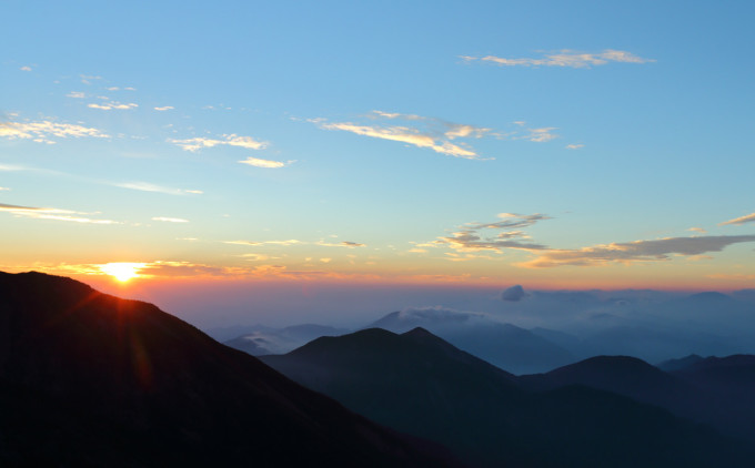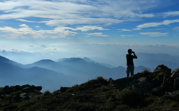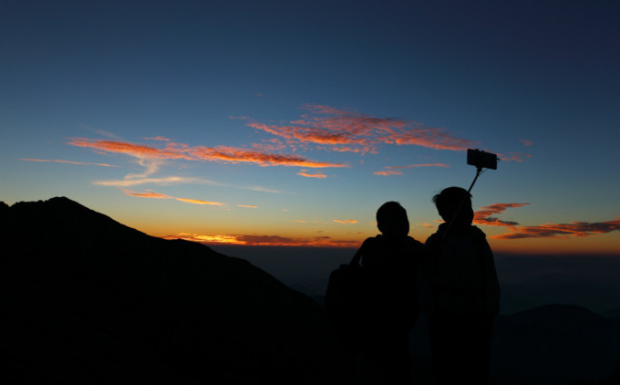 因为高反,无法继续前进,住宿在大文公庙三十多人的大套间。日出时分,一对自拍父子的剪影。