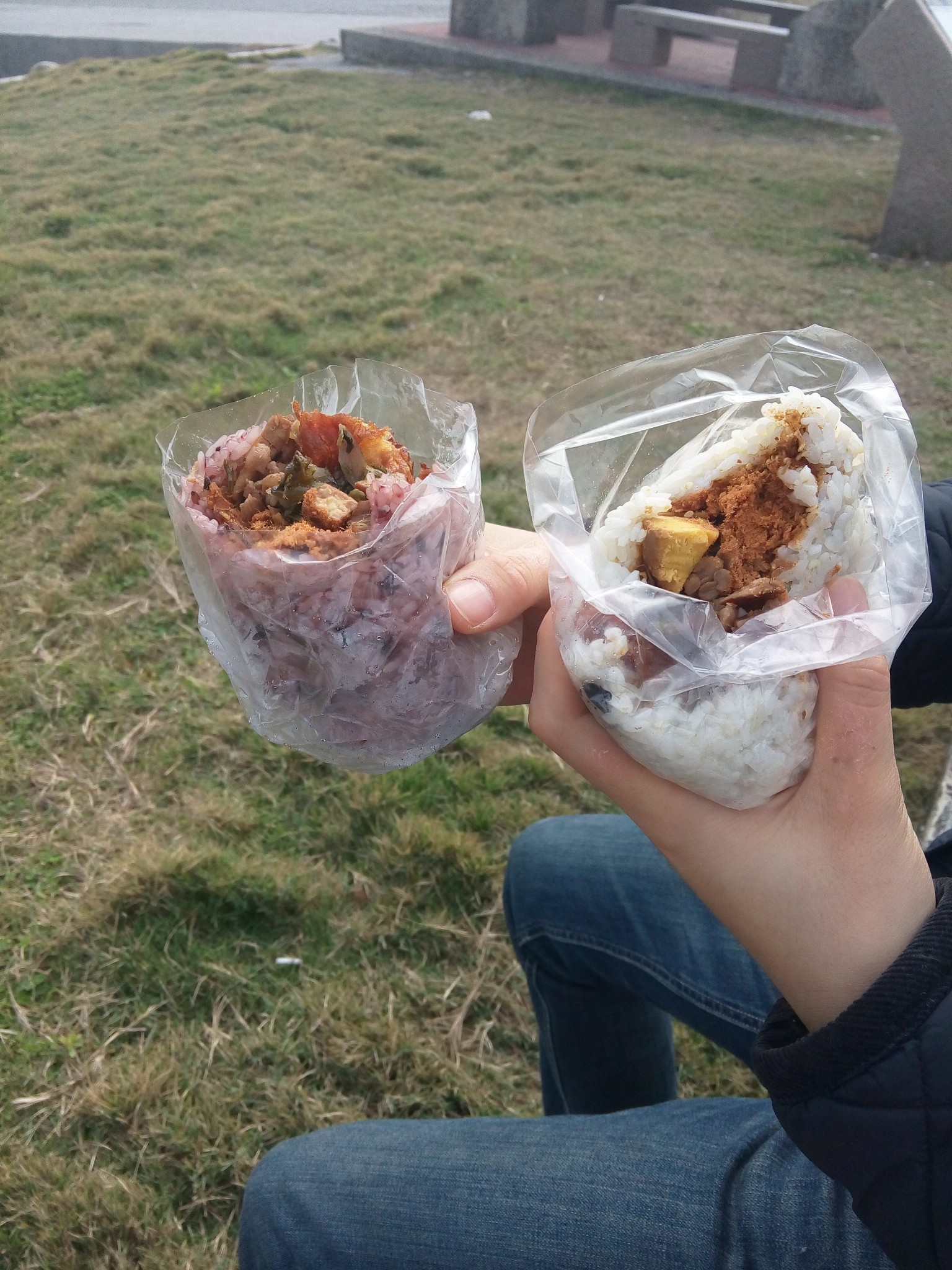 这是民宿的早饭,老板一大早运过来的饭团,超级大,他说是他的奶奶做的,吃了一半就撑到了,剩下的一半给一路跟着我们的狗狗辣 >o<