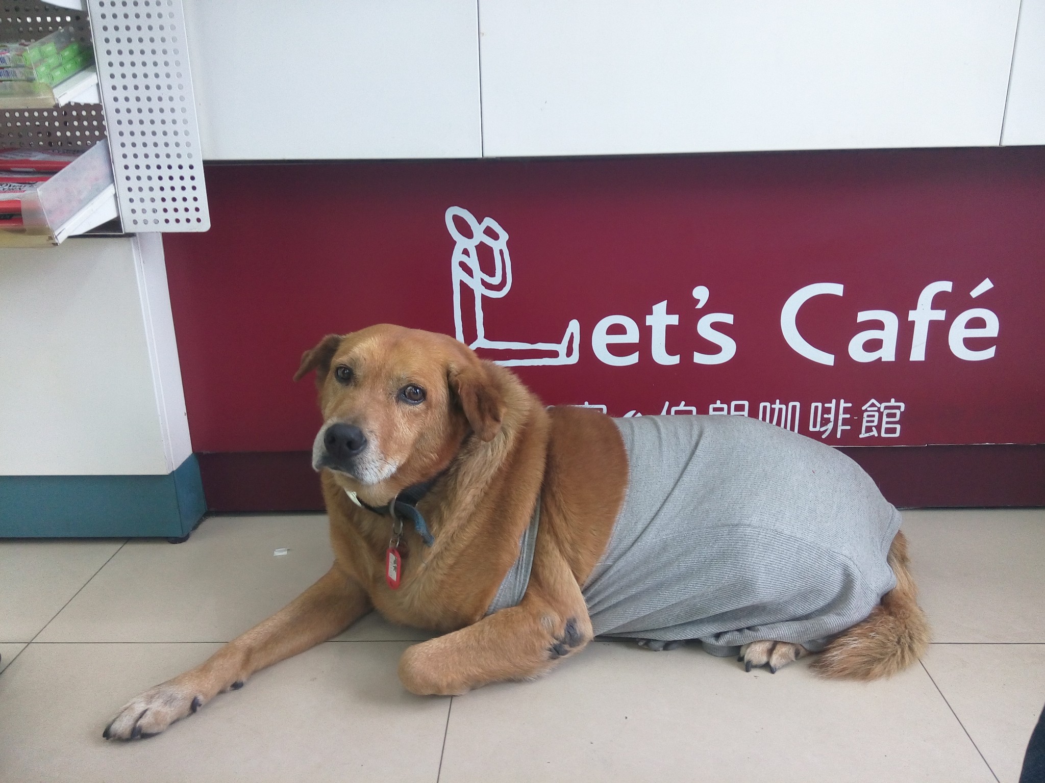旁边超市里有只狗狗在看守——