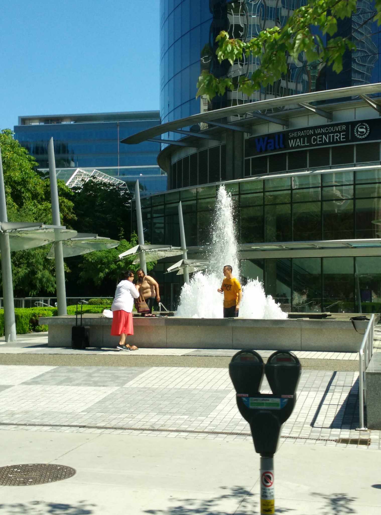 在去往酒店的路上,等红灯时,偶然发现在喷水池中冲凉的人......天气有这么热吗