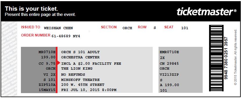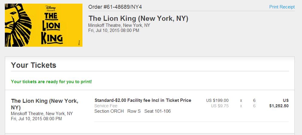 1. 百老汇《狮子王》的演出:在www.ticketmaster.com网站上买的,可以选座喔!选的票价是$199/人,含税含订票手续费最终价格$1255.7 (原先预计我们是6人,因为演出十分火爆,几乎场场爆满,所以提前一个多月就定了喔!)