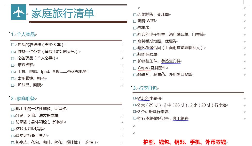 展示一下我们的行李清单: