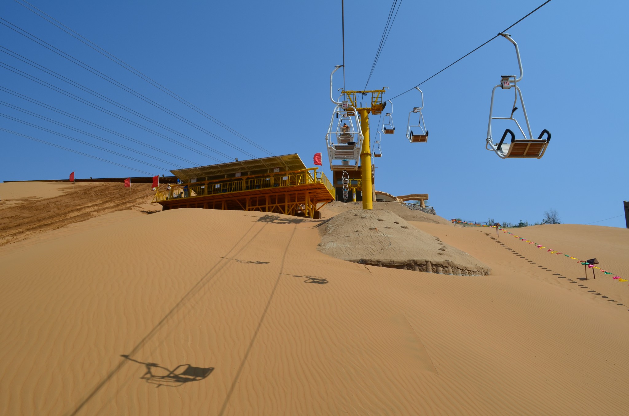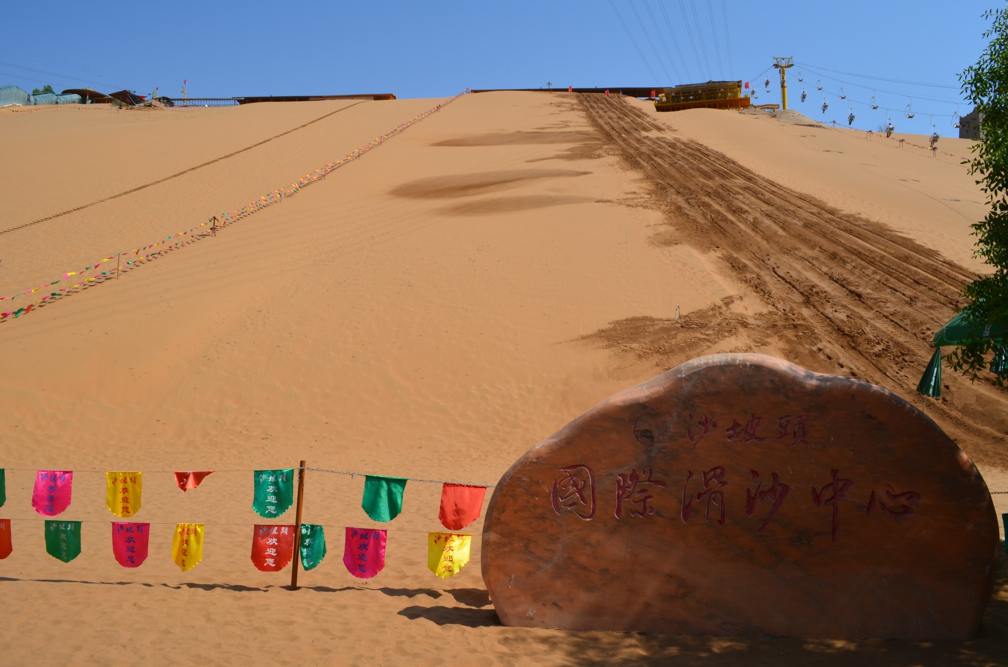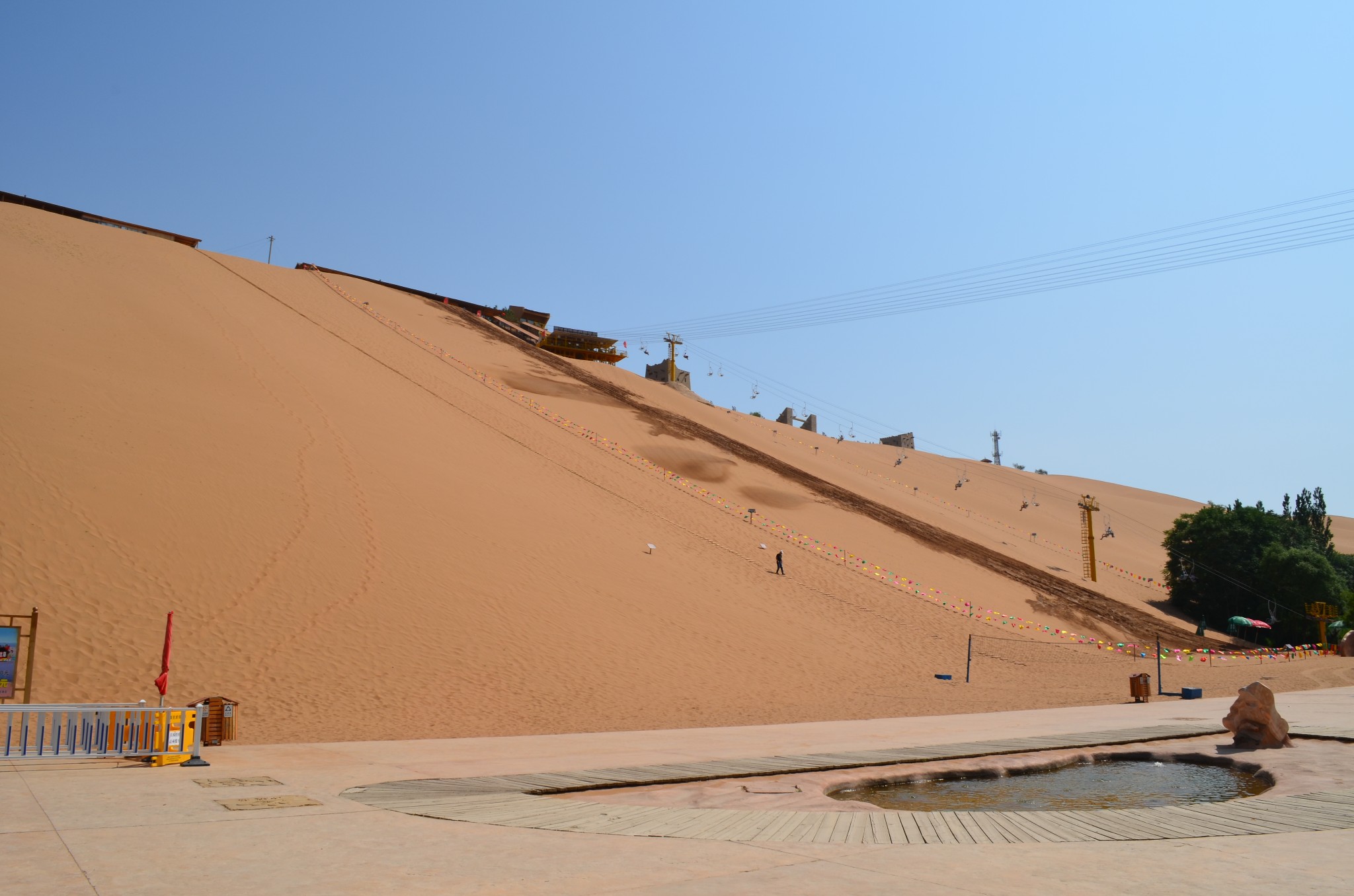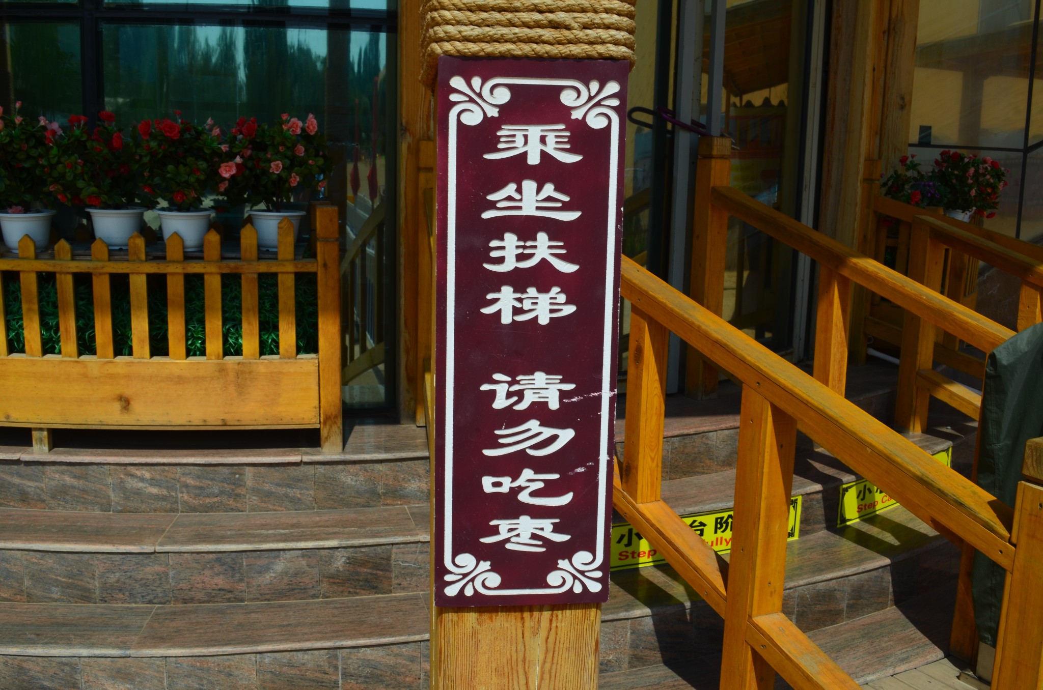 登上沙山有三种方式,一种是步行攀登,第二种是坐缆车,第三种是乘坐自动扶梯。只是这个自动扶梯外面“请勿吃枣”的告示,让人觉得信息量很大。