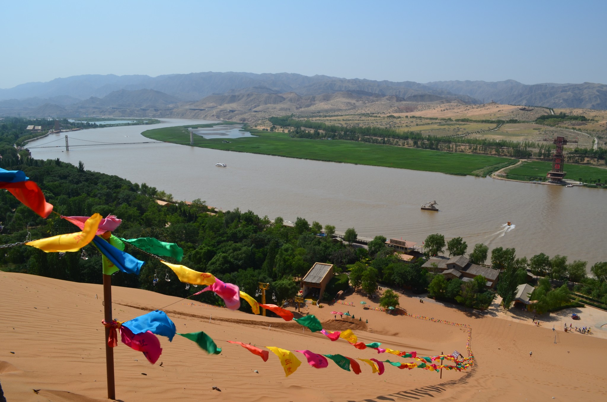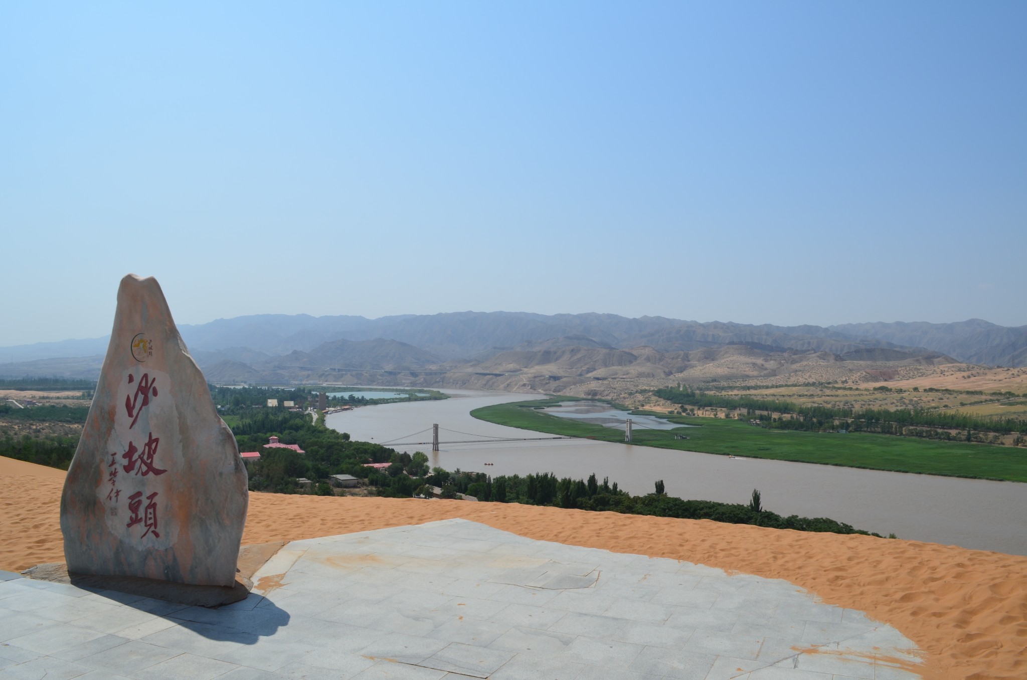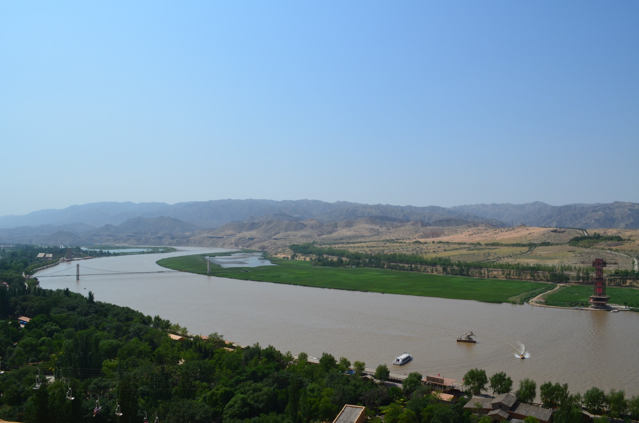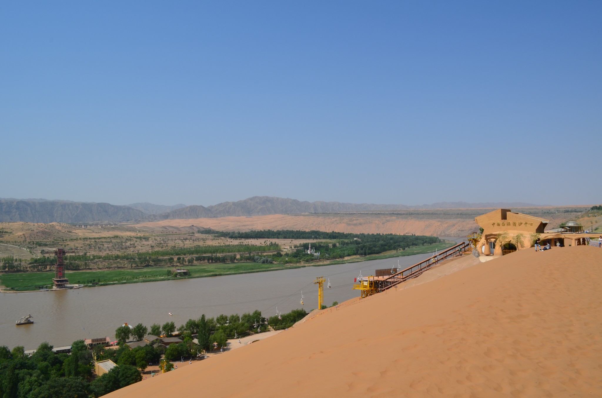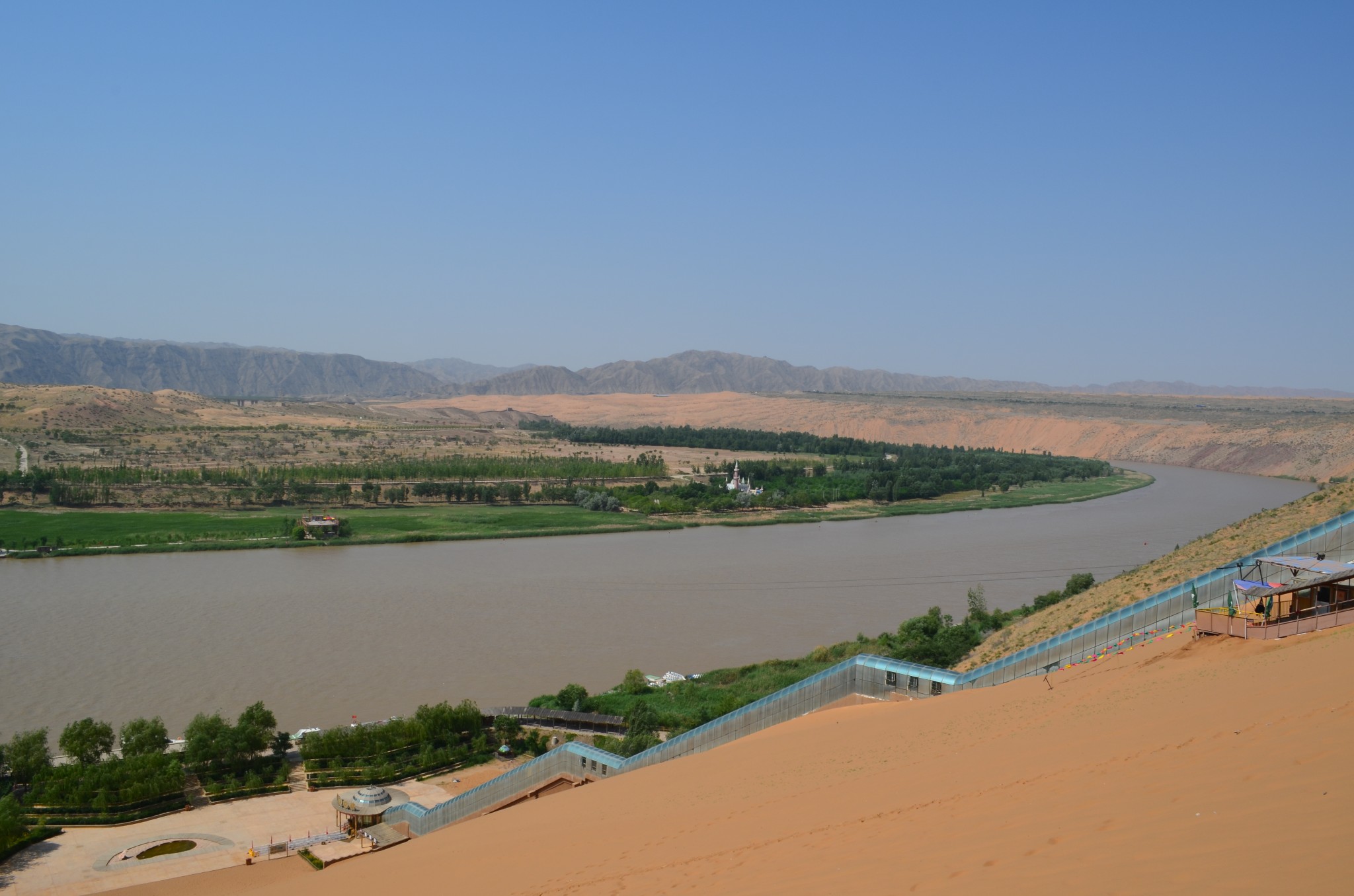 由于联票里附送的扶手电梯停运,改乘缆车登上沙山。没走两步,便可望见中华民族母亲河那雍容华美的腰身。