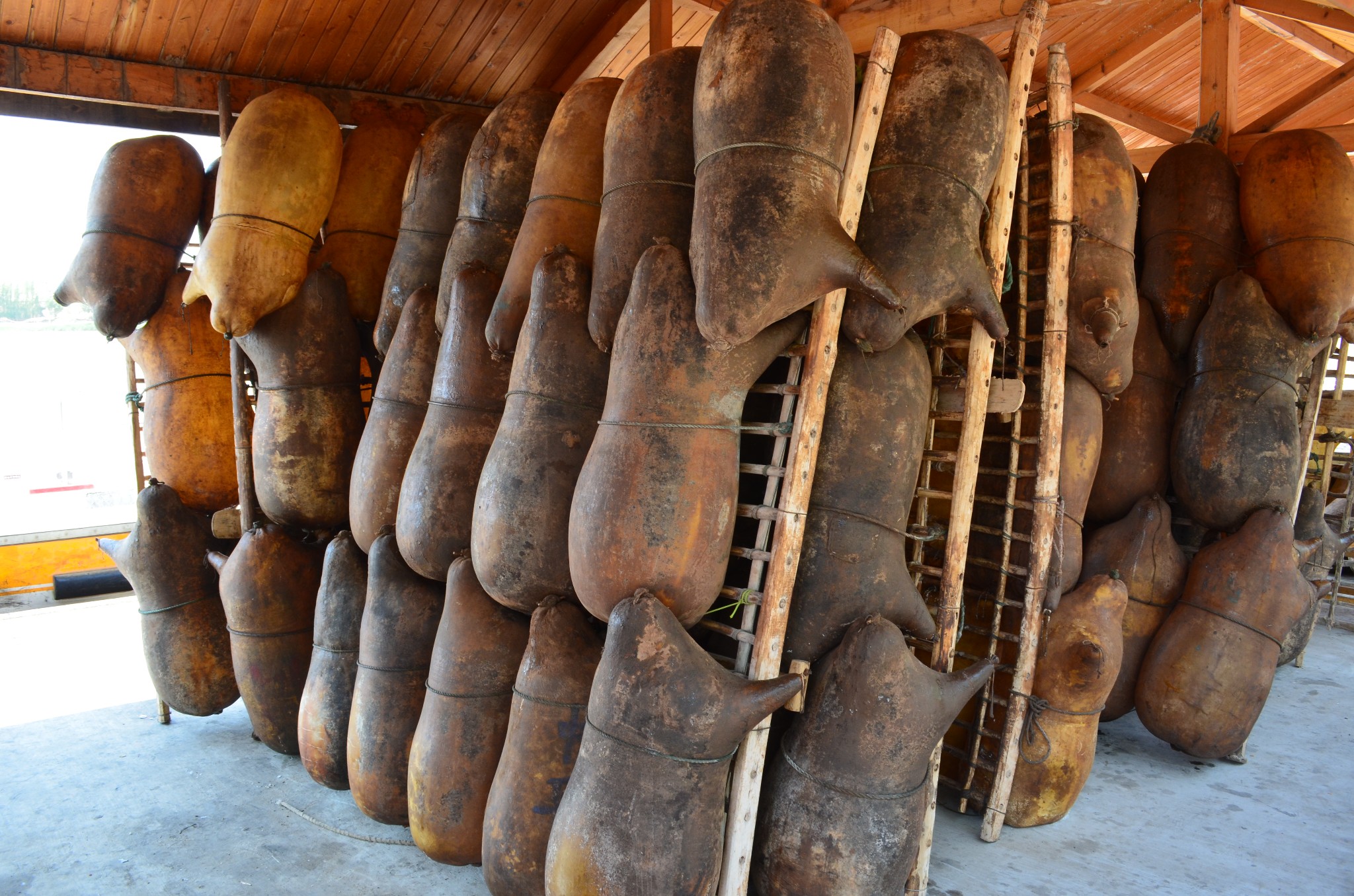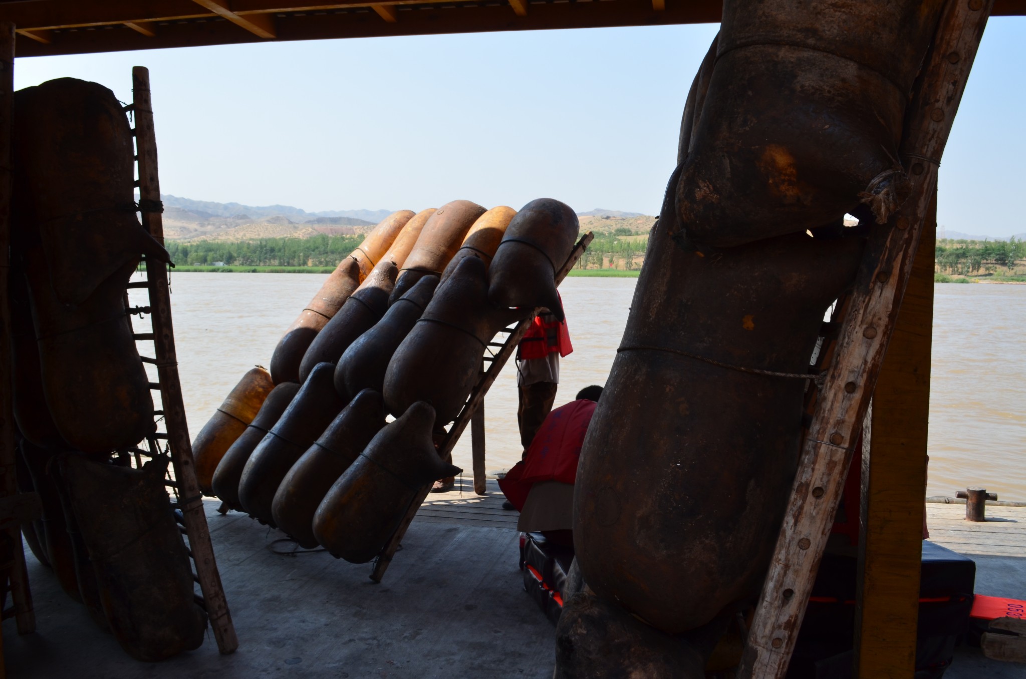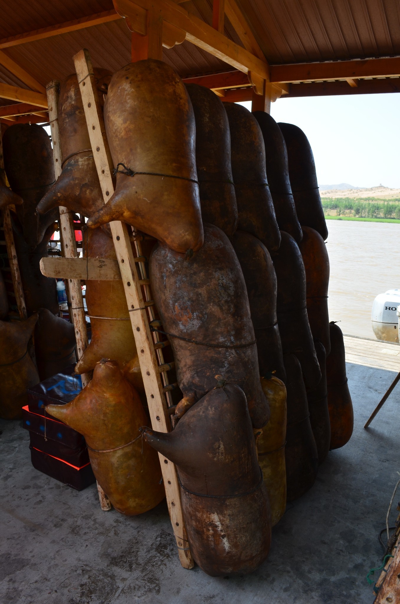 我们乘坐的这种羊皮筏子属于较小的类型,由十三只羊皮胎捆扎而成,每个皮胎都必须使用完整的羊皮,宰杀时不能划破一丁点毛皮,再吹气使皮胎膨胀,灌入清油、食盐和水,然后扎紧头尾和四肢,最后经过晾晒,所得皮胎黄褐透亮,看上去就像一个鼓胀的圆筒。 对于这种在黄河上使用了几百年的交通工具的制作过程,民间有“杀他一只羊,剥他一层皮,吹他一口气,晒他一个月,抹他一身油”的形象说法。