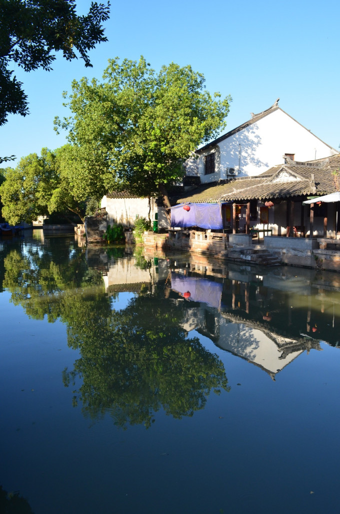 总之,早晨六点,客栈老板养的公鸡还没有打鸣,我便已草草起床,扛着相机出去散步。此时的整座古镇空无一人,静寂无声。 白墙黑瓦倒影在波光粼粼的水中,宛若镜中的世界伸出手脚,努力拉住现实中的世界,不愿分开。这种联系如此美好,却又如此脆弱,哪怕仅仅是一颗石子投入水中,激起层层涟漪,都能将这种脆弱的联系迅速切断,更不用说那些即将摇着撸经过的乌篷船了。