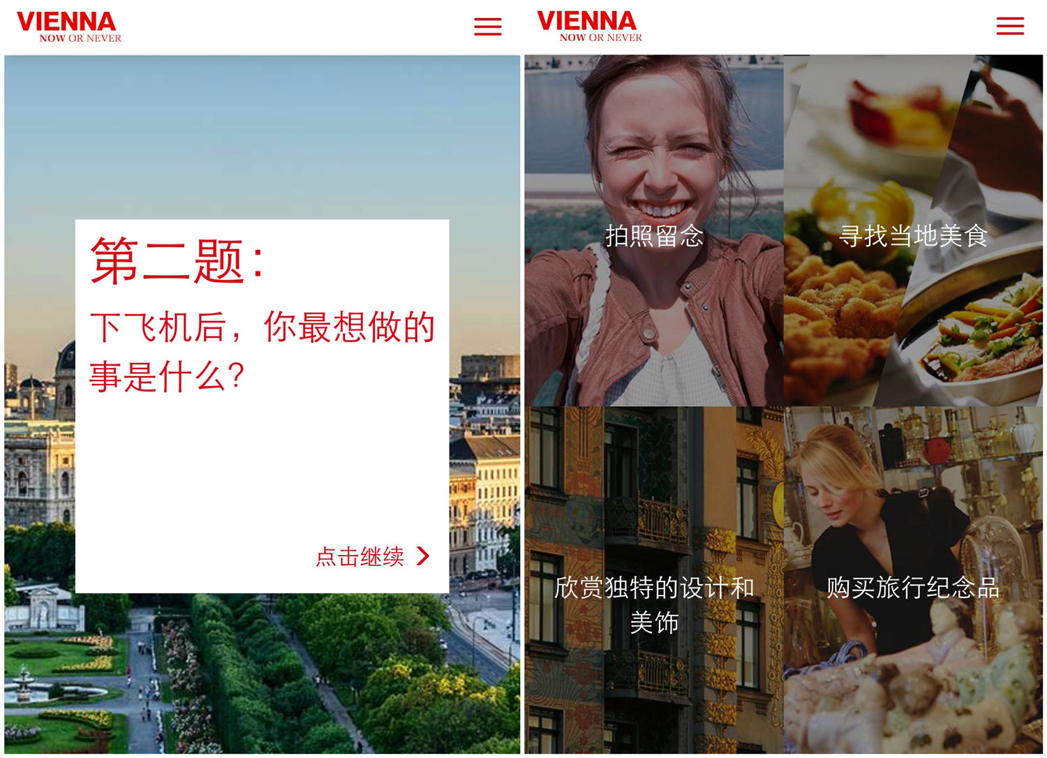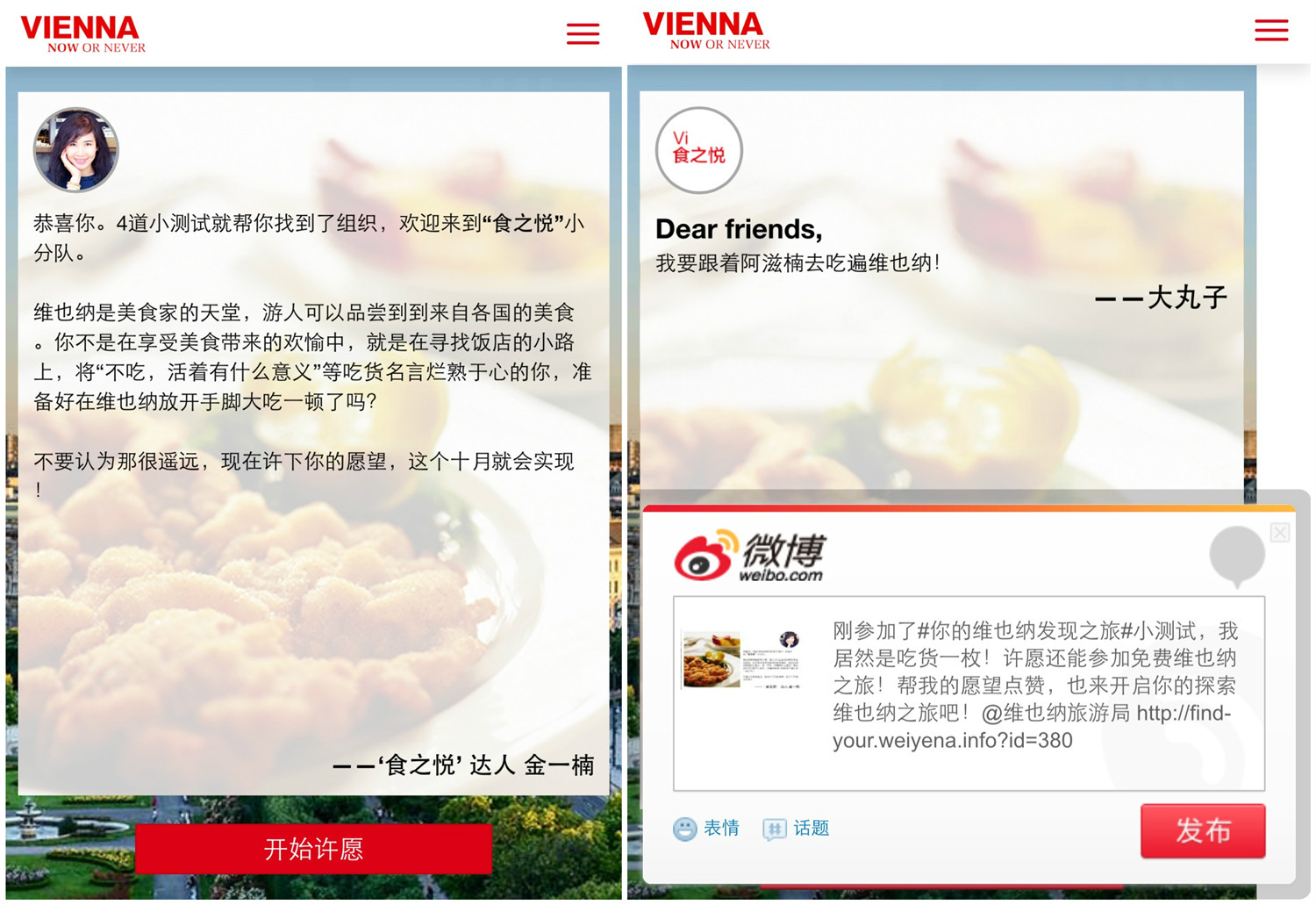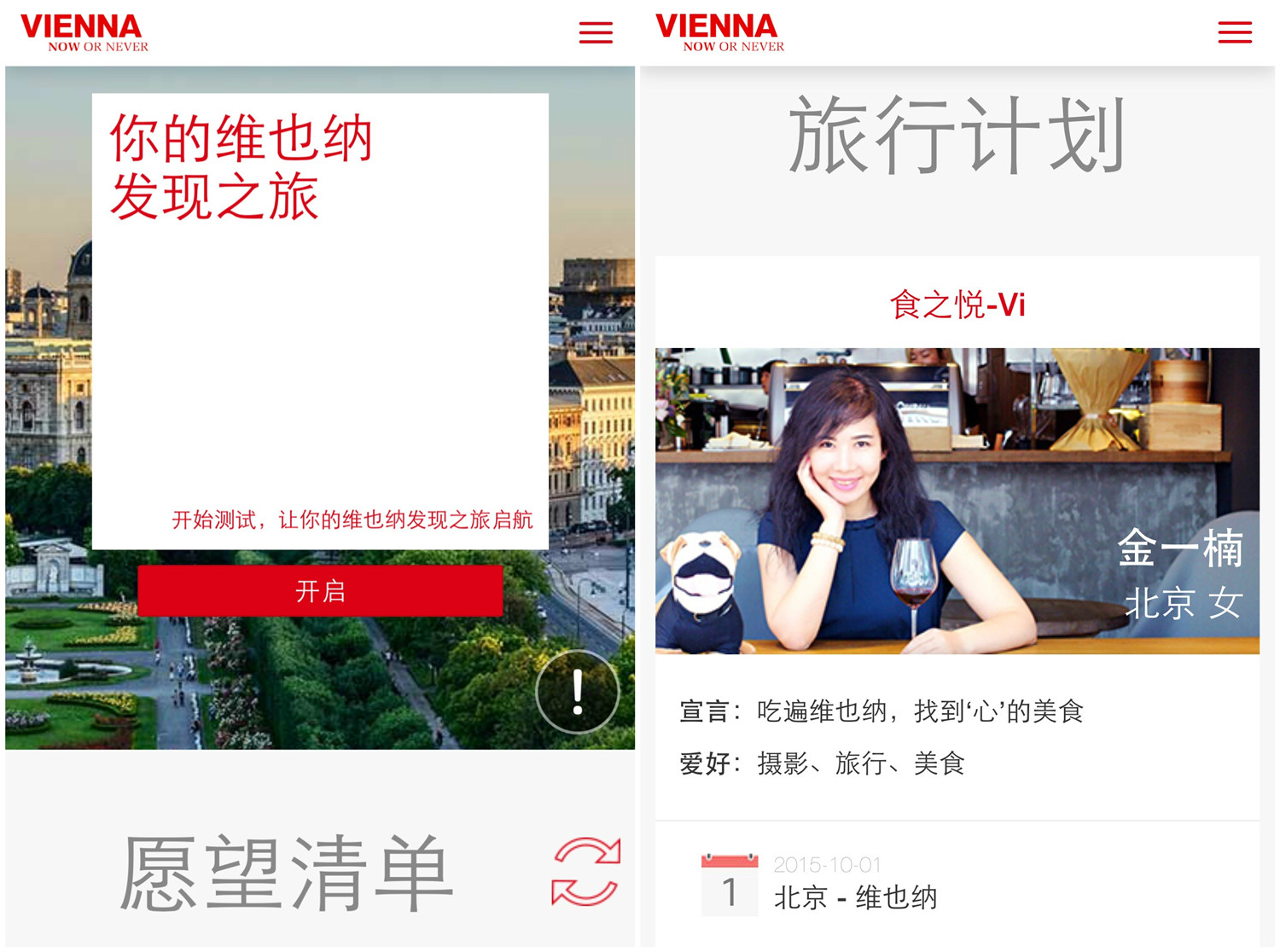 1、打开维也纳旅游局的页面:http://find-your.weiyena.info/ 可以看到我的食之悦旅行计划,也会看到一个测试题界面,点击那个红色的大按钮【开启】