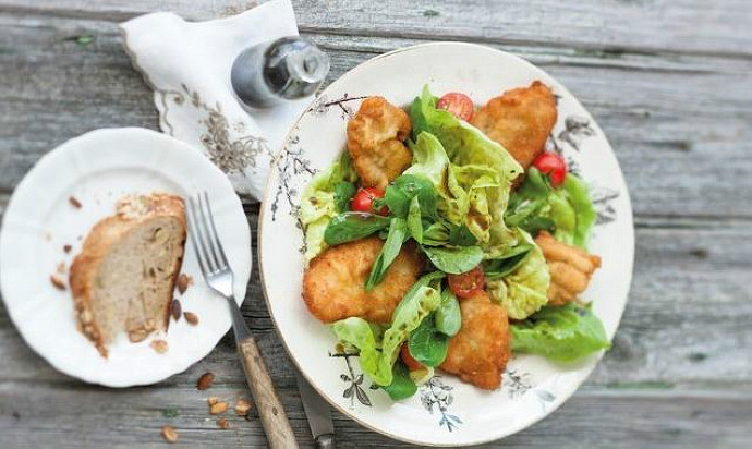 她最喜欢的Steirisch Backhendlsalat!沙拉里面有土豆,鲜嫩的鸡肉,浇上特产——南瓜籽油,会有一种特殊的清香,搭配沙拉非常美味。