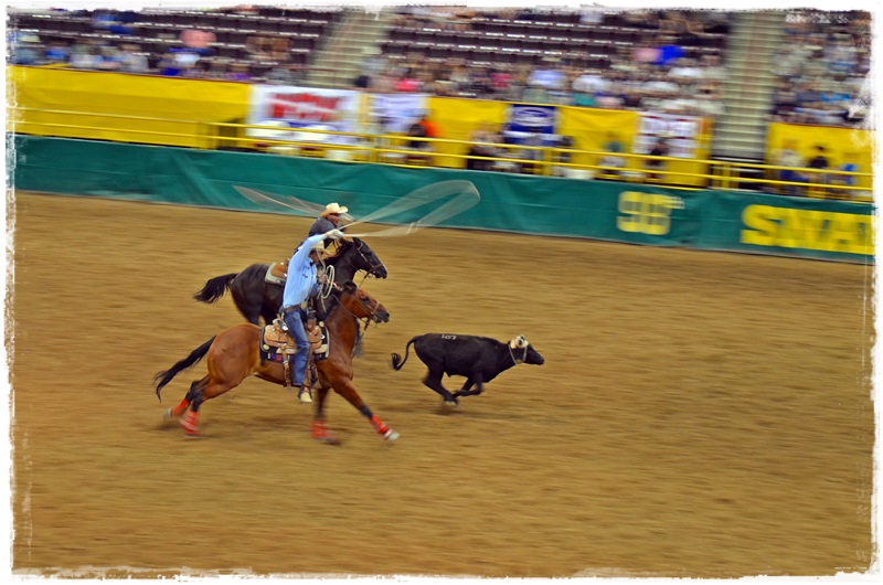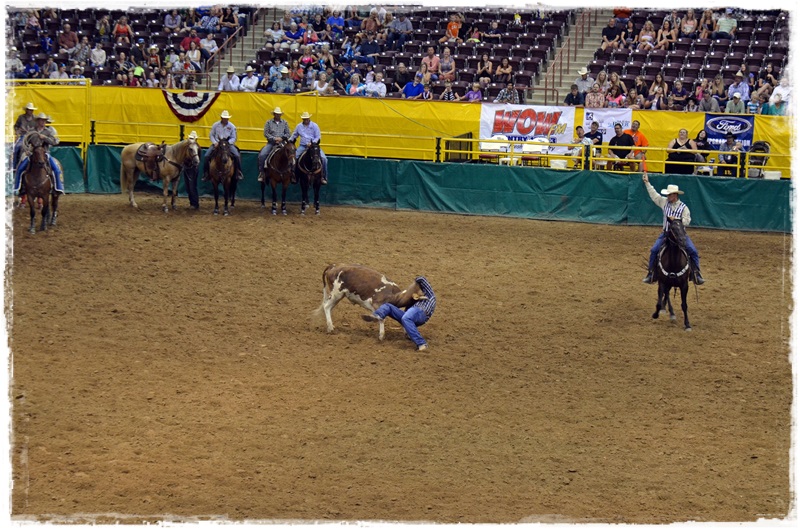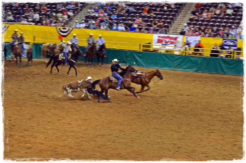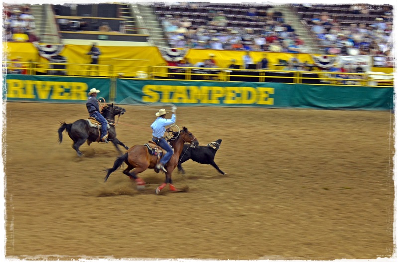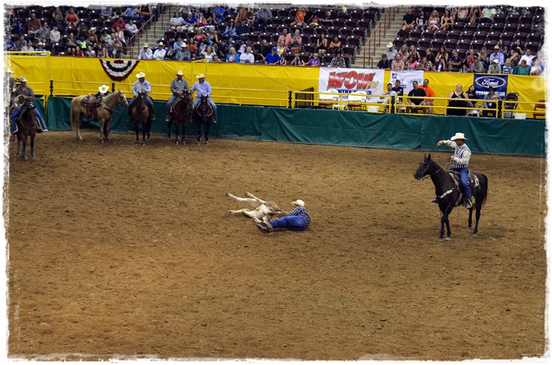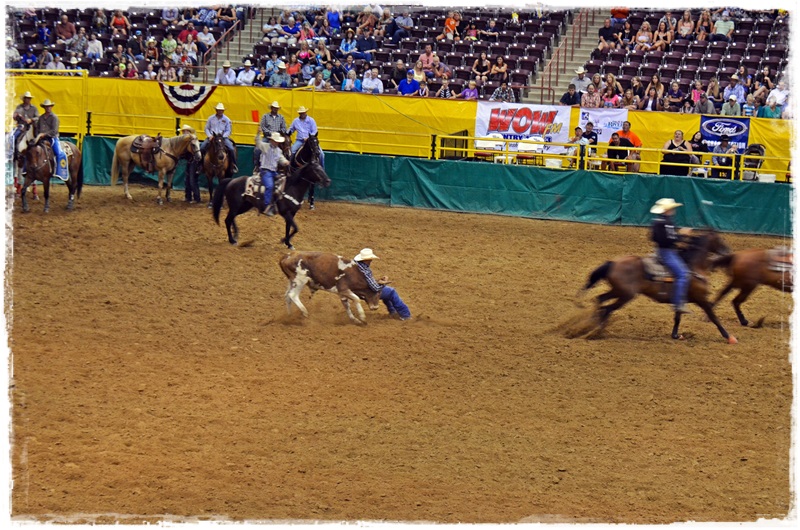 抓小牛,两匹马夹击,其中一个牛仔要饿虎扑食般地从马上扑向小牛并把它掀翻在地。当然也有扑空的。