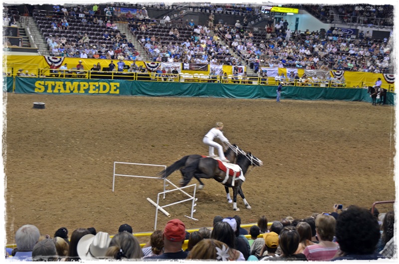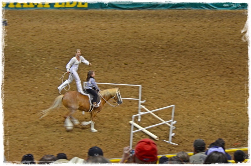 骑野马比赛。这些个野马也挺倔,出了栏就不停的跳,还都是高难度动作。当个牛仔是真不容易!