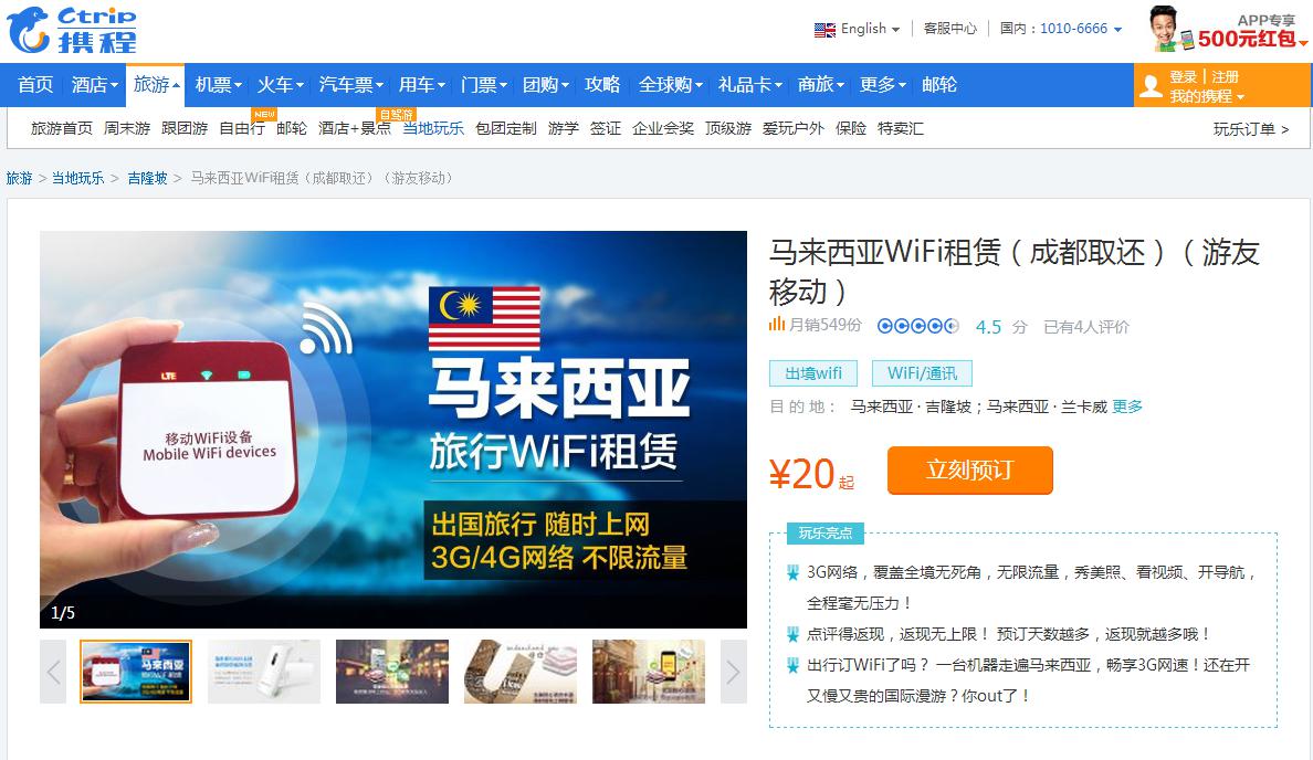 马来西亚移动WIFI:20RMB/台/天 携程预定