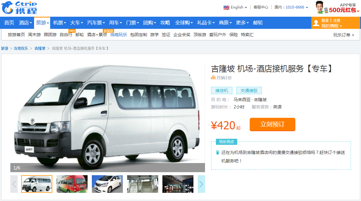 机场-酒店接送专车服务费:110RMB/人 携程预定