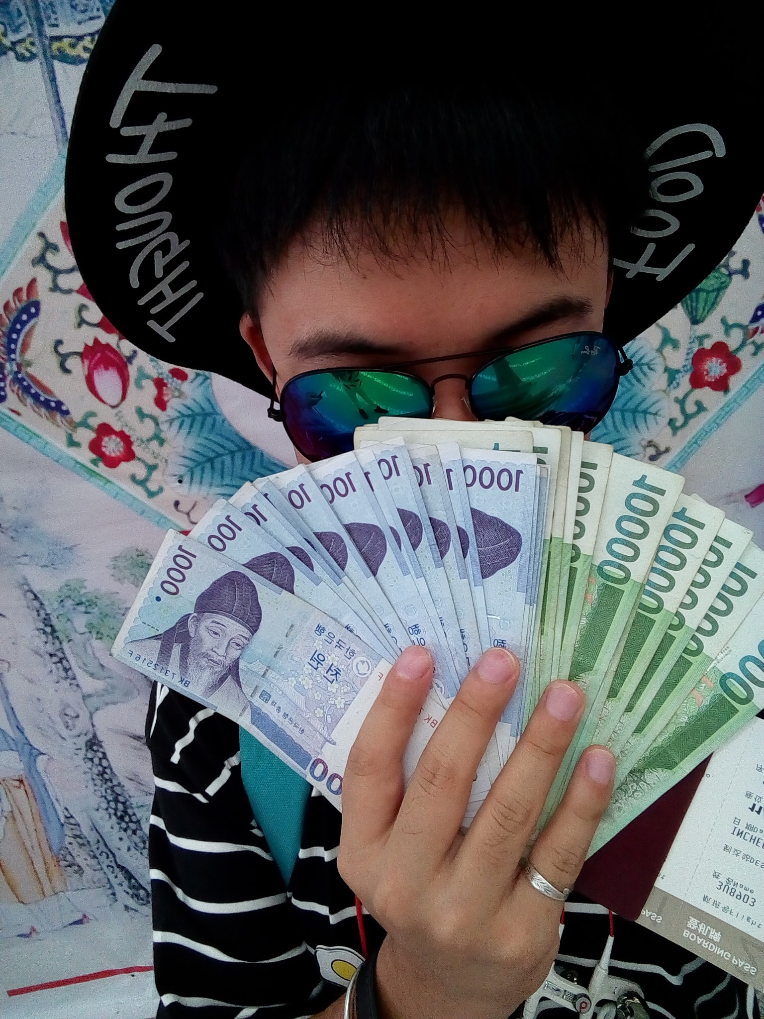 按点集合,我们这个团20人,除了我们几个外,其他的都是按家庭为单位来计算的,母女结伴出游最多,三代的也有,每家基本都是家长带着孩子。然后导游说去机场换韩币很不划算,因为韩币汇率不稳定,而且中间要过美元的换算,在导游手里换的话1000人民币换170000韩币。秒变万元户啊,然并卵,因为在首尔一瓶矿泉水1000就没有了……
