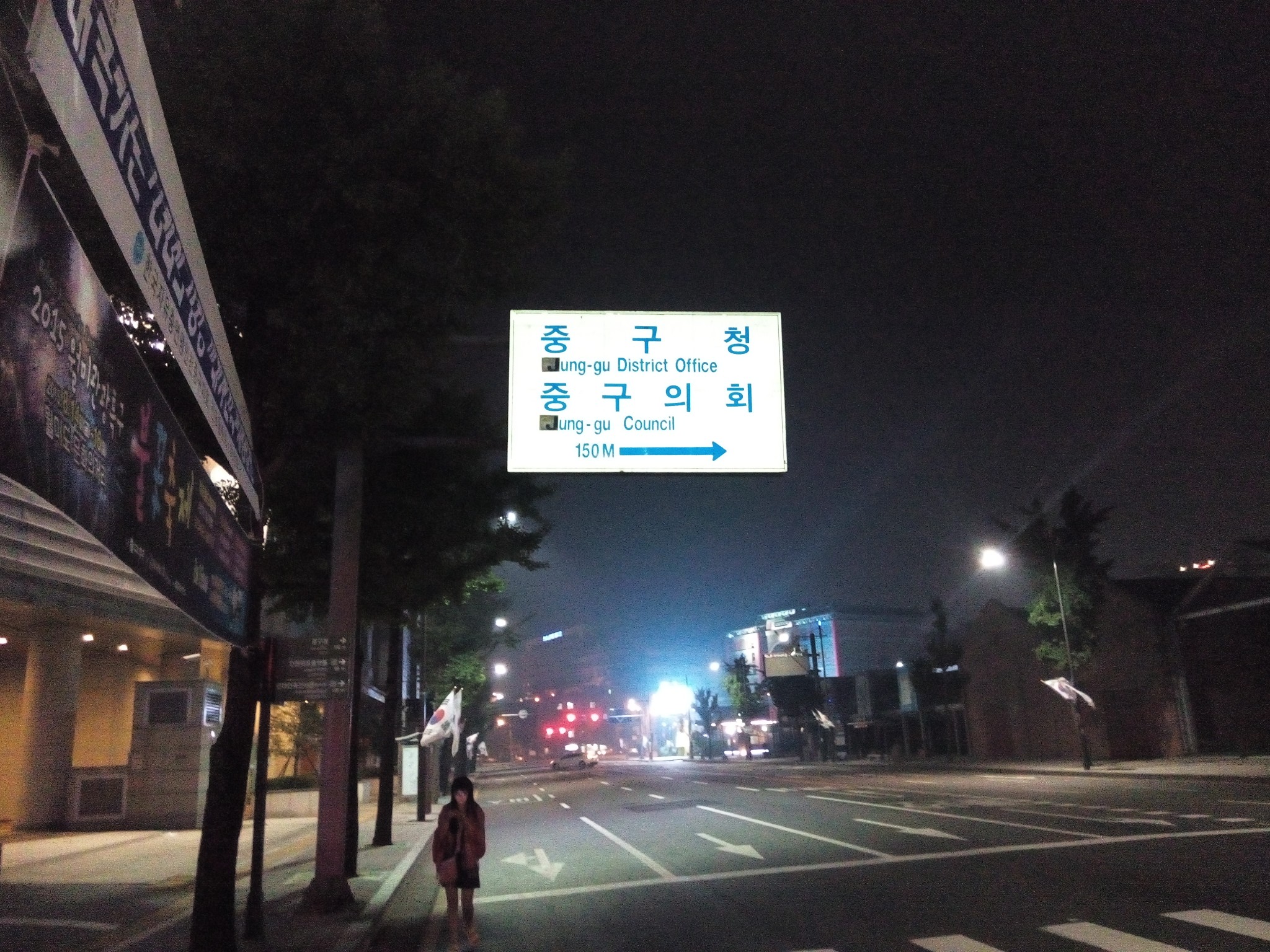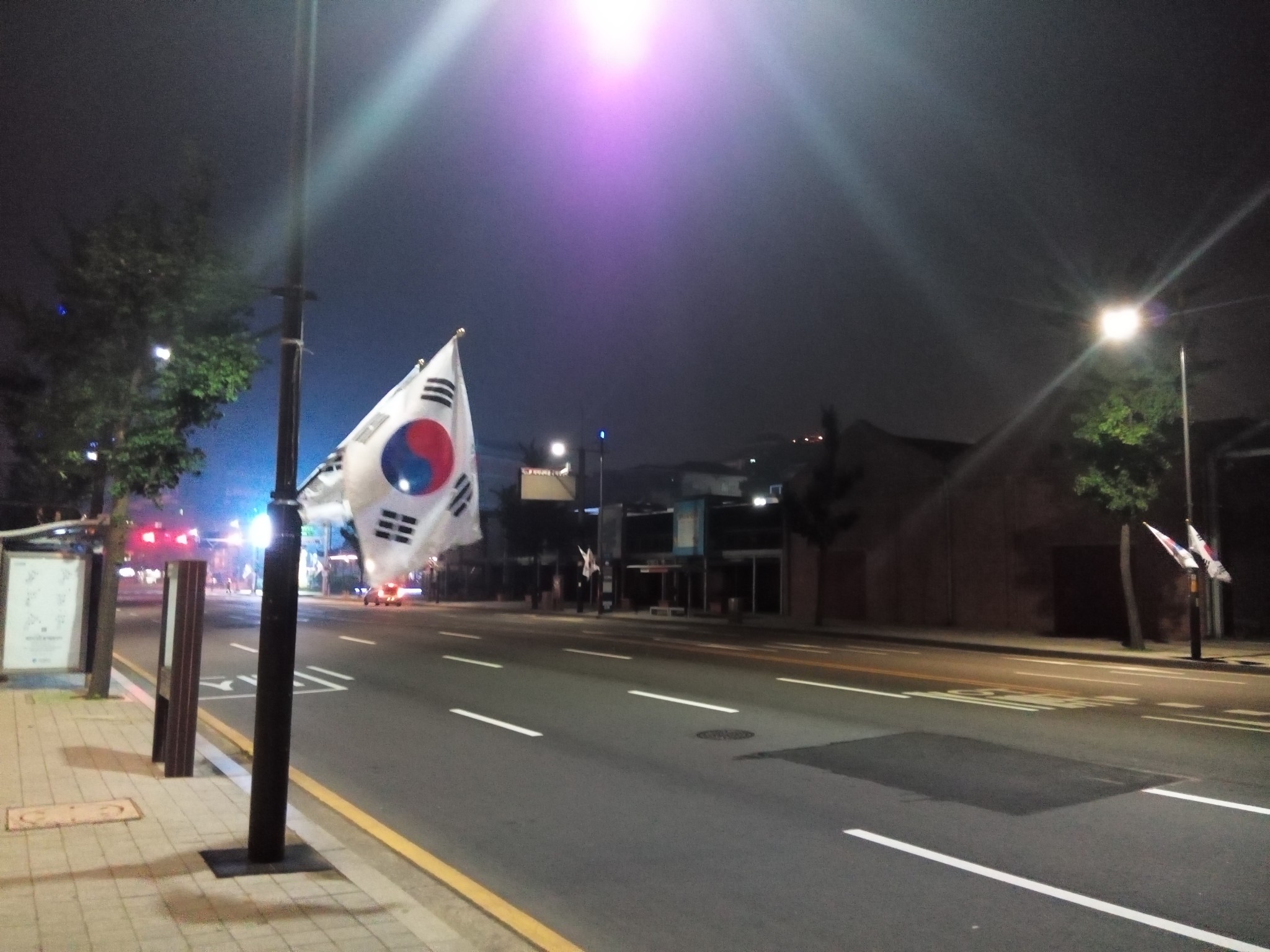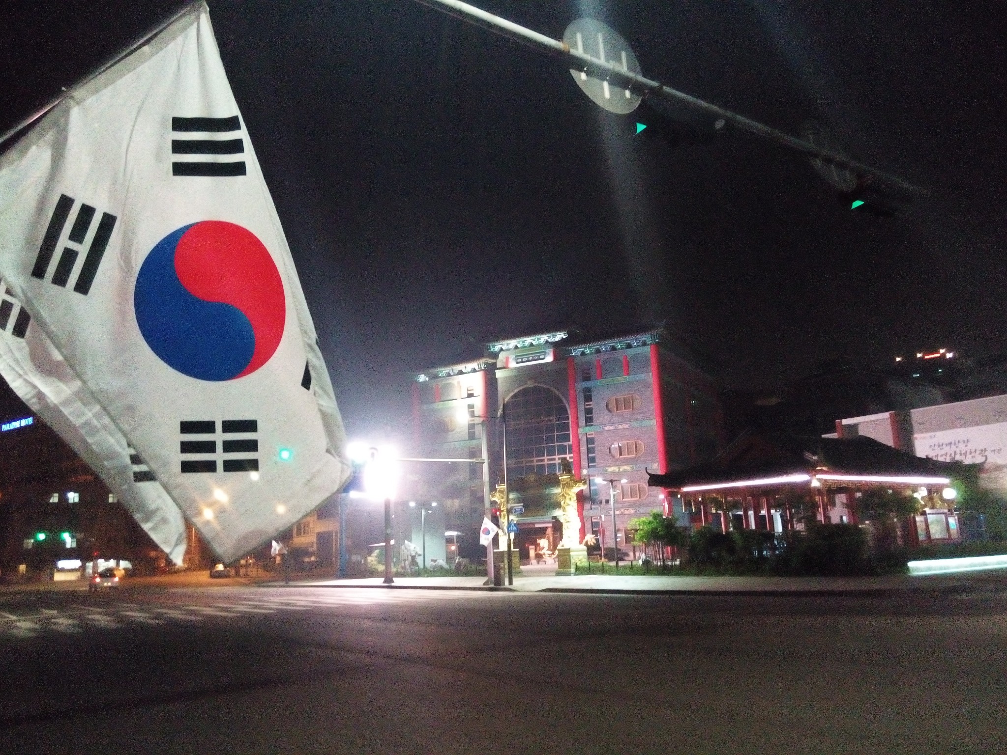 放下行李,洗漱,然后休息,11点,我们一帮人果然不甘心就此睡觉,于是拉帮结伙地就溜出酒店去溜达了。满大街的韩国国旗,然后基本看不到行人的灯火通明的街道,还有和成都的闷湿空气不一样的凉爽的半岛气候,一切都显得那么轻松惬意呢。