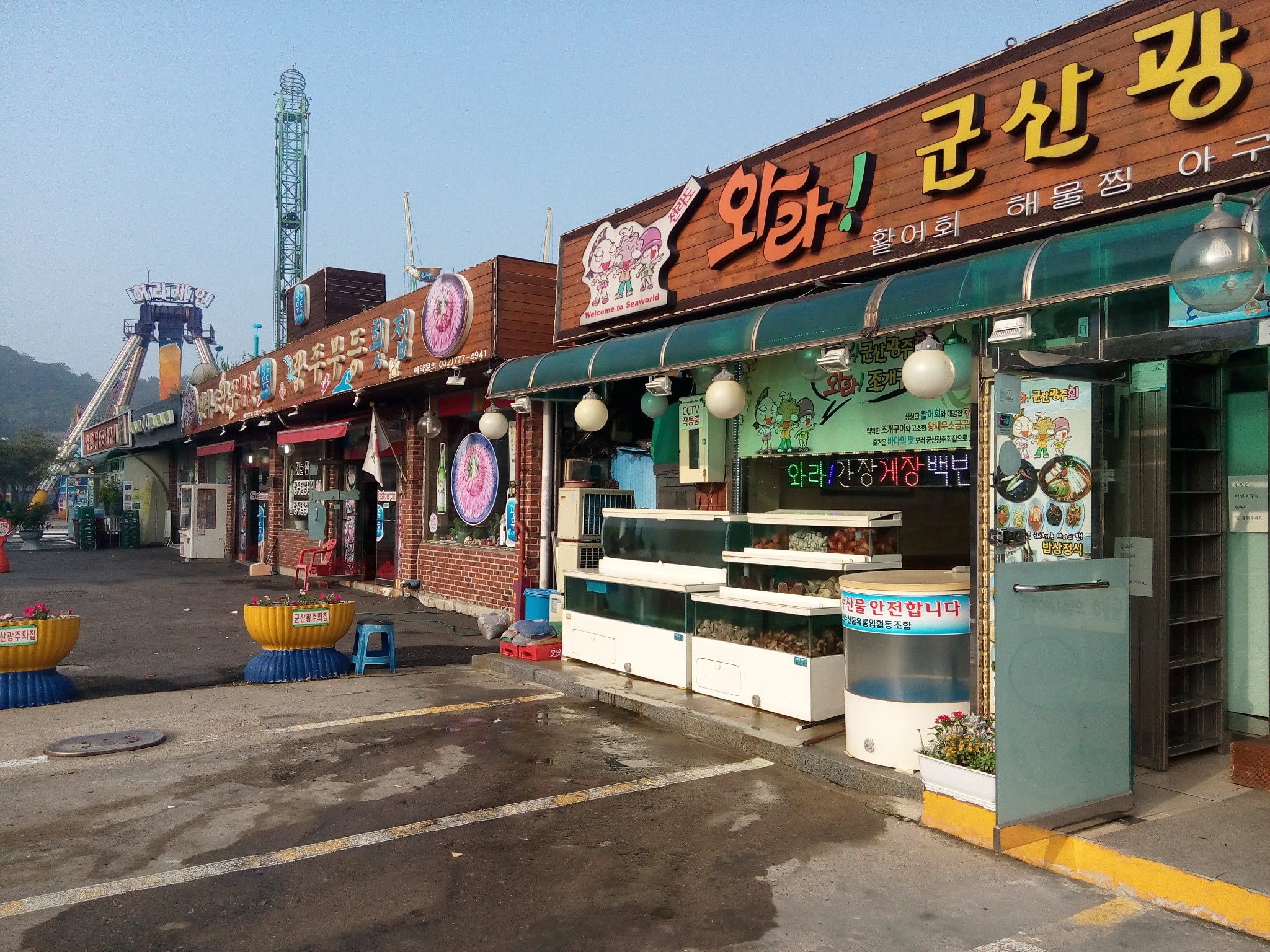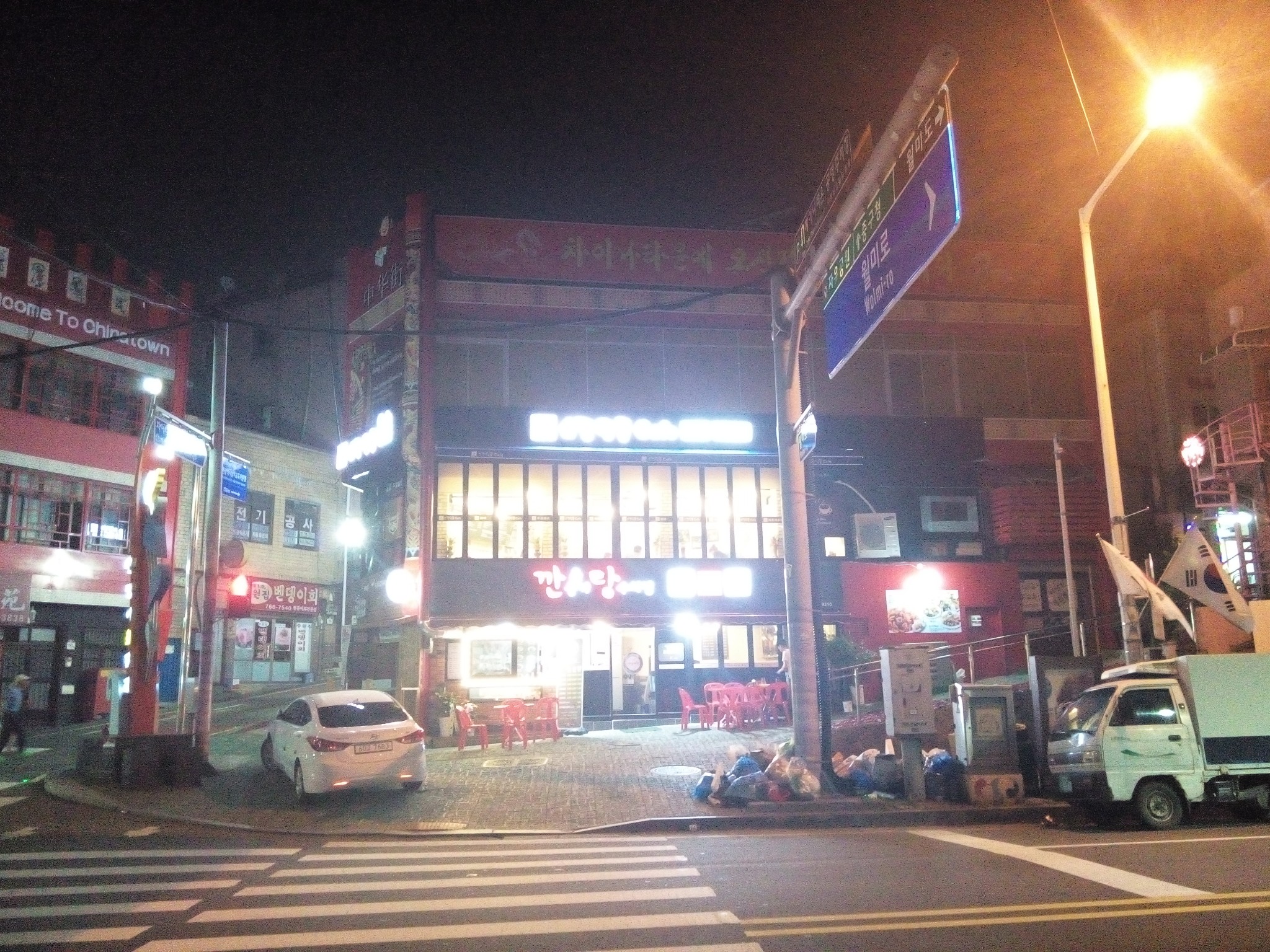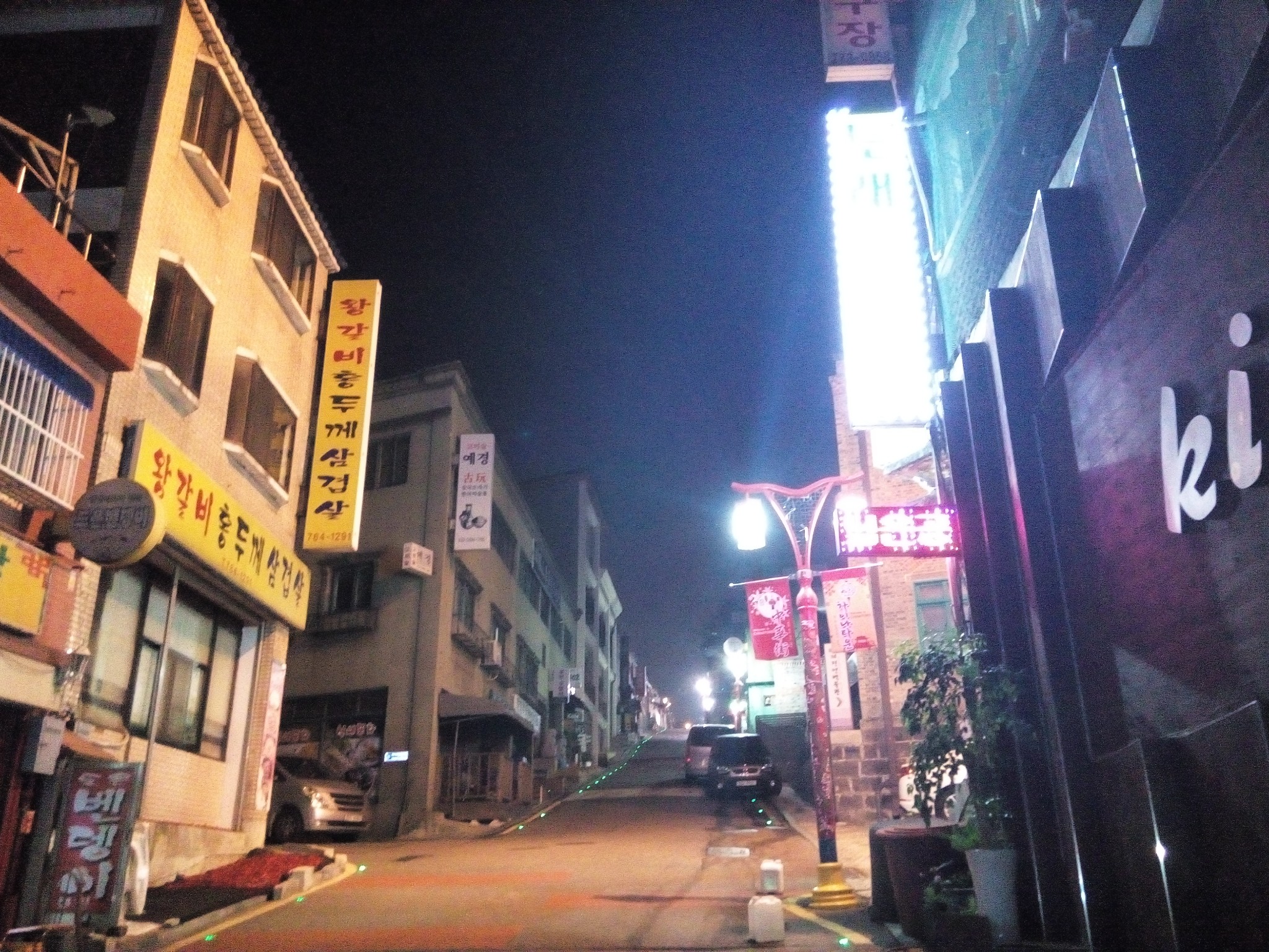 虽然在机上吃得蛮多,但我们还是不甘心地在无人的大街上边逛边觅食。前台说的5分钟路程的便利店我们没找到,果然是因为我们任性到出门就乱走的缘故么?走到一家店前,搞不清楚人家物价,而且全是韩文也看不懂,在门口犹豫半天……最后才发现人家11点已经打烊,正在收拾厨房……