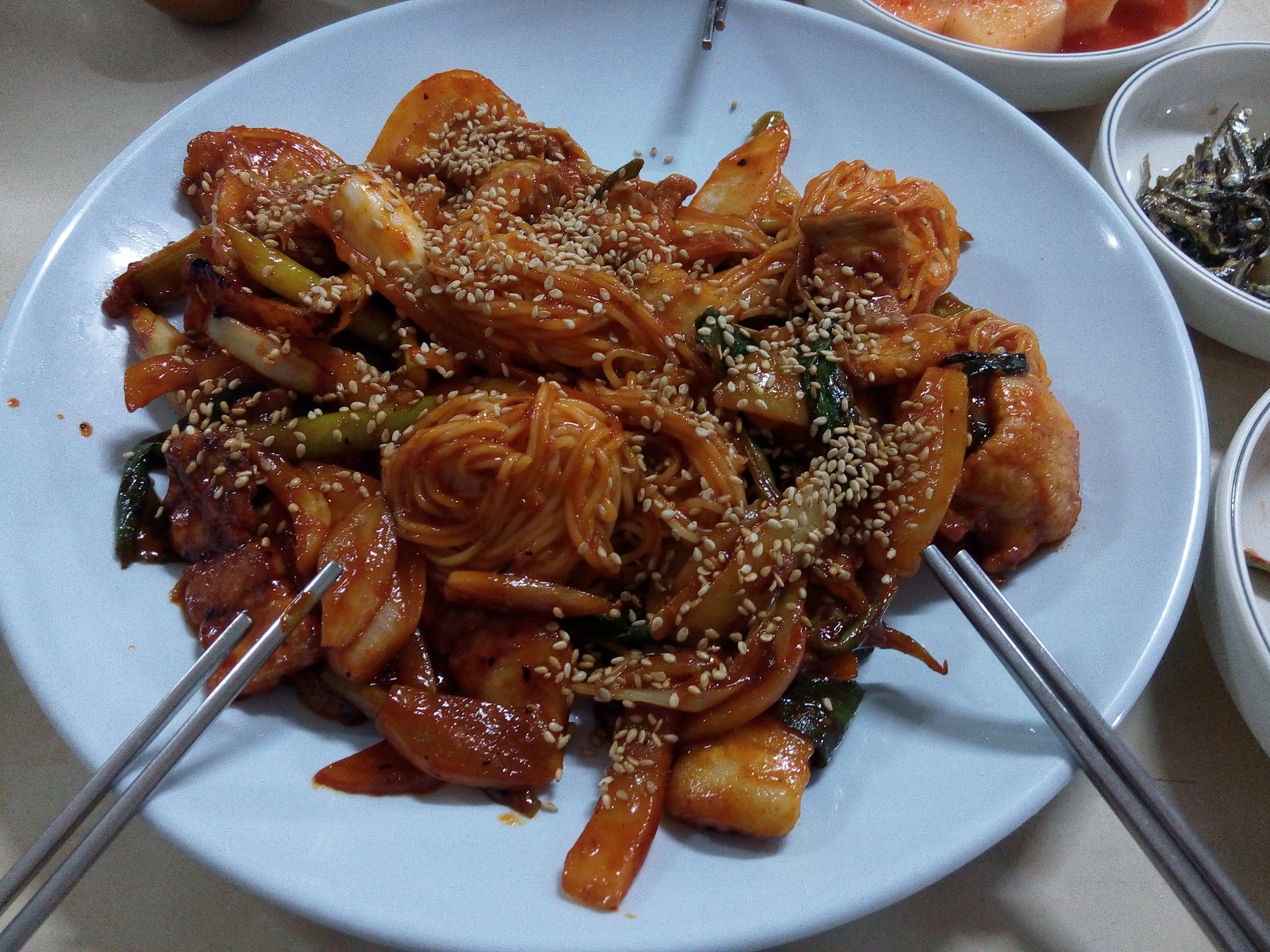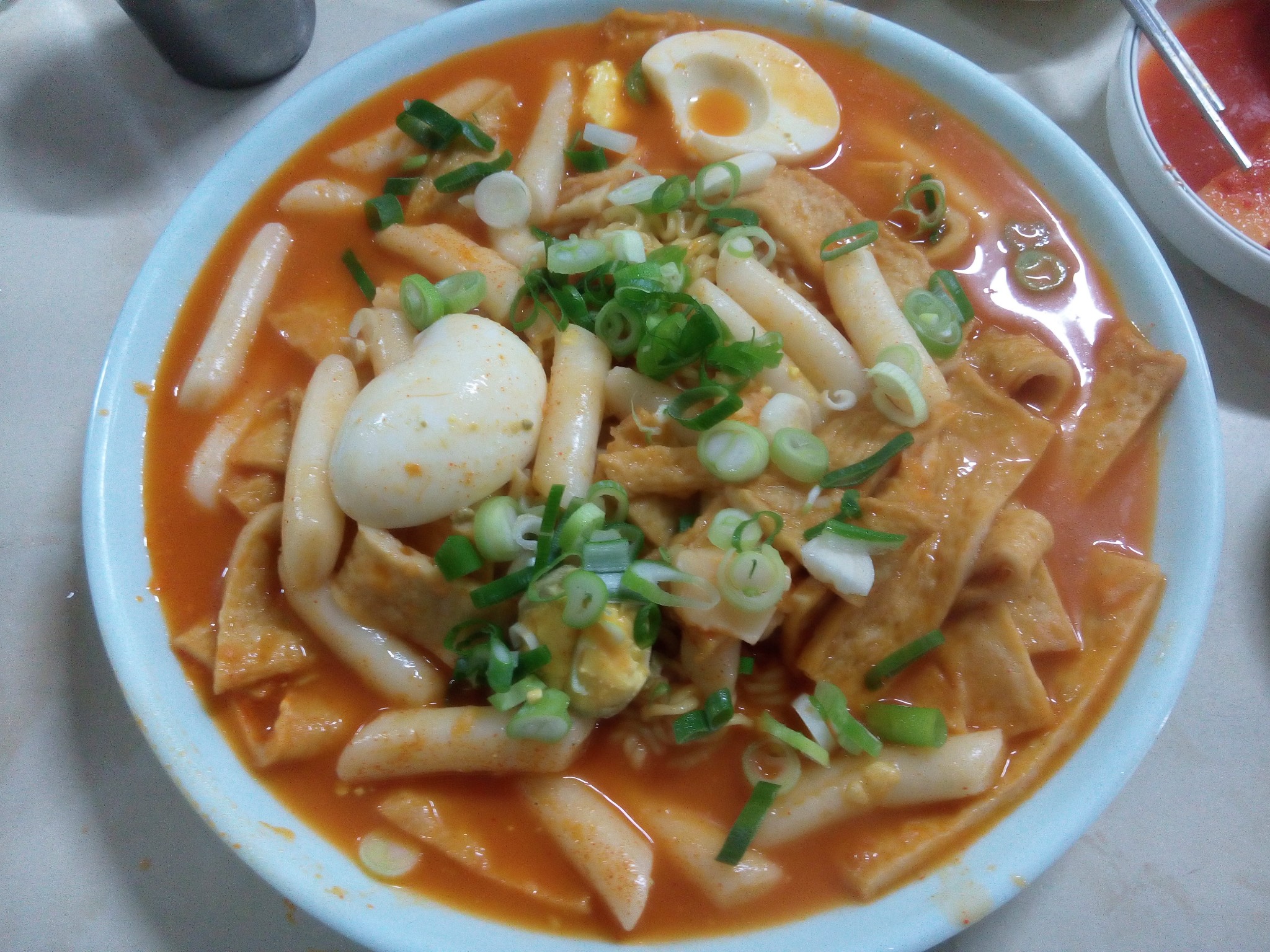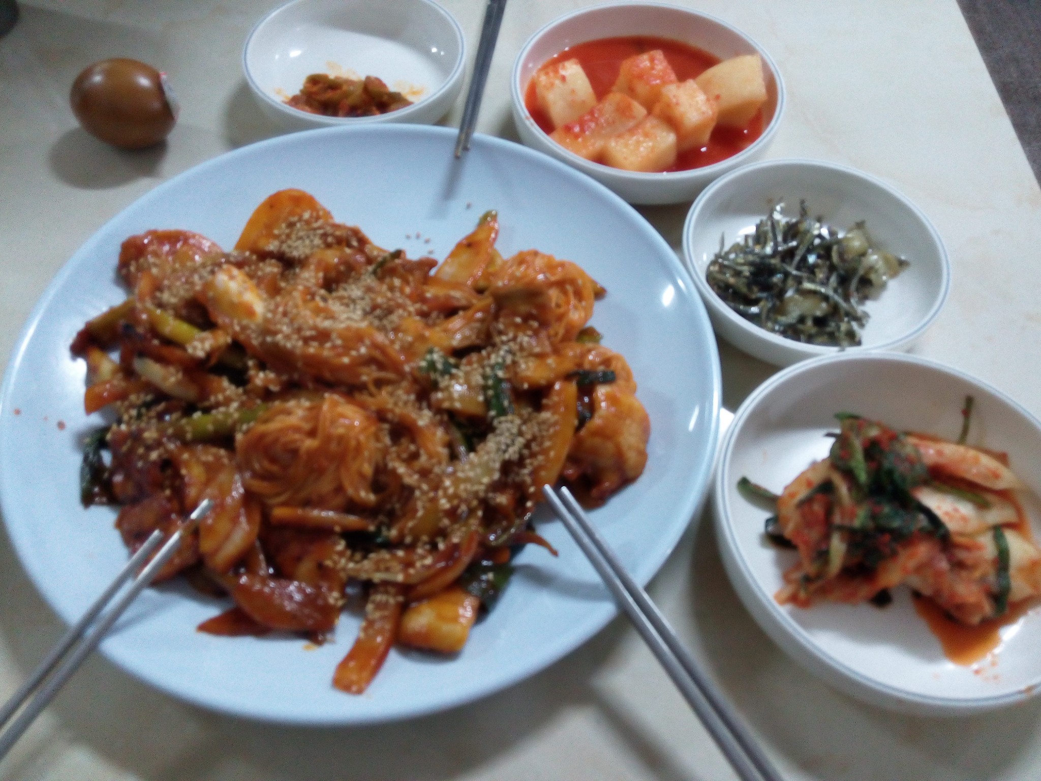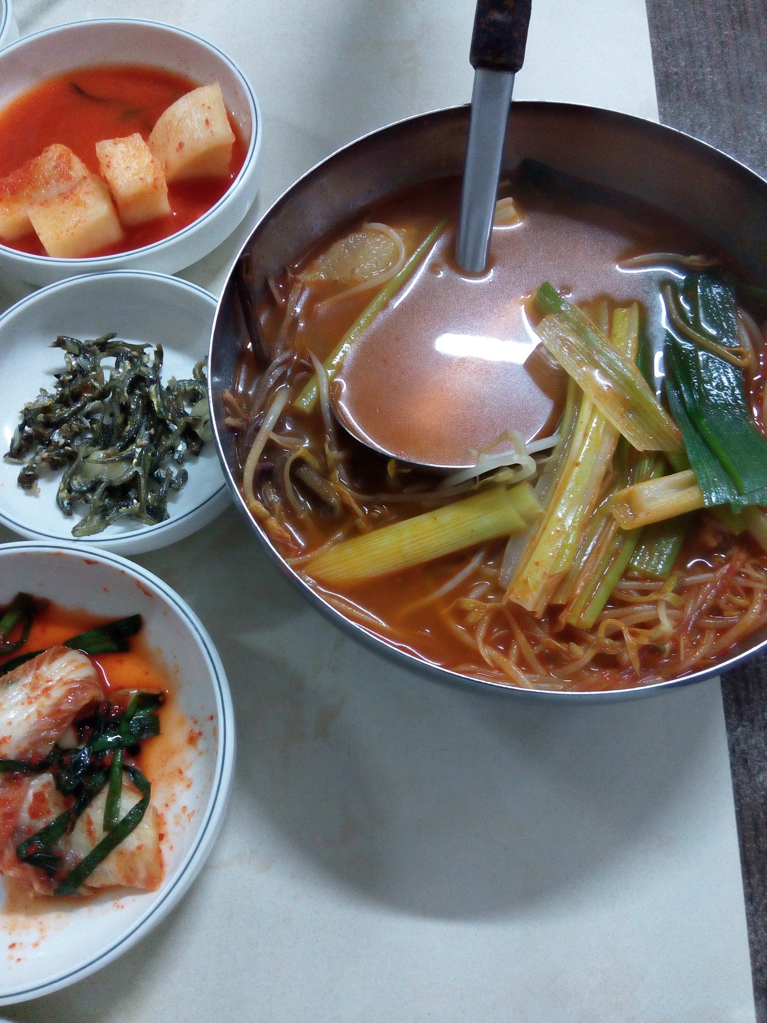 然后莫名转到了中国城。在一家小卖铺买了一堆零食,然后最后完全不懂韩语的一行人还是怯生生地钻进了一家店里。老板是个阿加西,正在一边看韩国版的爸爸去哪里一边和朋友喝酒吃饭,然后热情接待了我们,还问我们是哪里来的。我们说成都,然后他表情加动作告诉我们:那你们一定很能吃辣……完全不知道点什么菜,而且,我们还完全没有适应韩币对应人民币的价值啊……然后点了海鲜猪肉杂烩,炒年糕,牛骨汤。