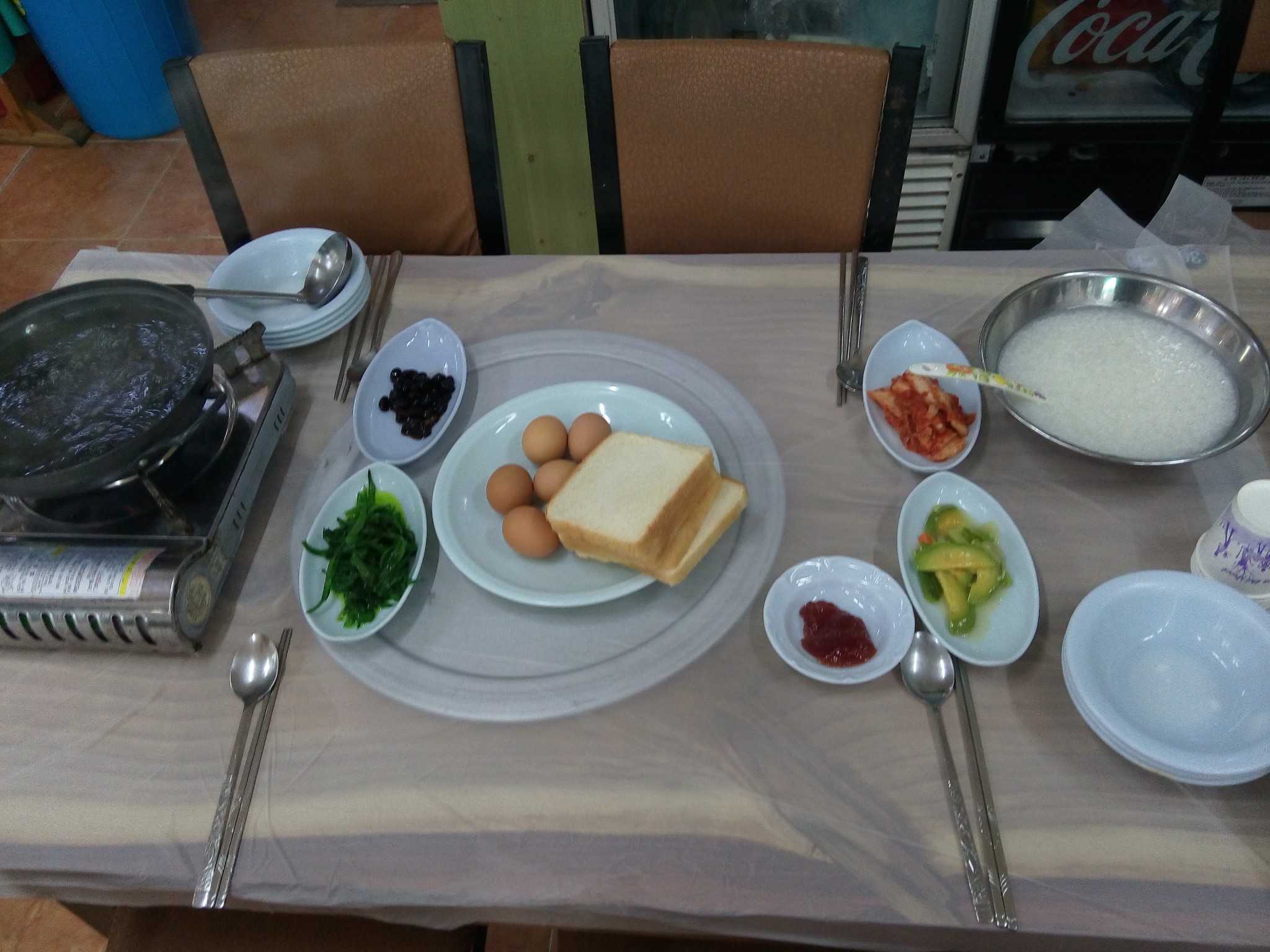 第一餐比较简单,在一家大排档,4人一桌,烧着海带汤,然后就是鸡蛋面包配各种小菜。当然,辣白菜是一路陪伴下来,虽然金导说每家的辣白菜因为都是自家做味道都不一样,但是我还是快吃吐了……