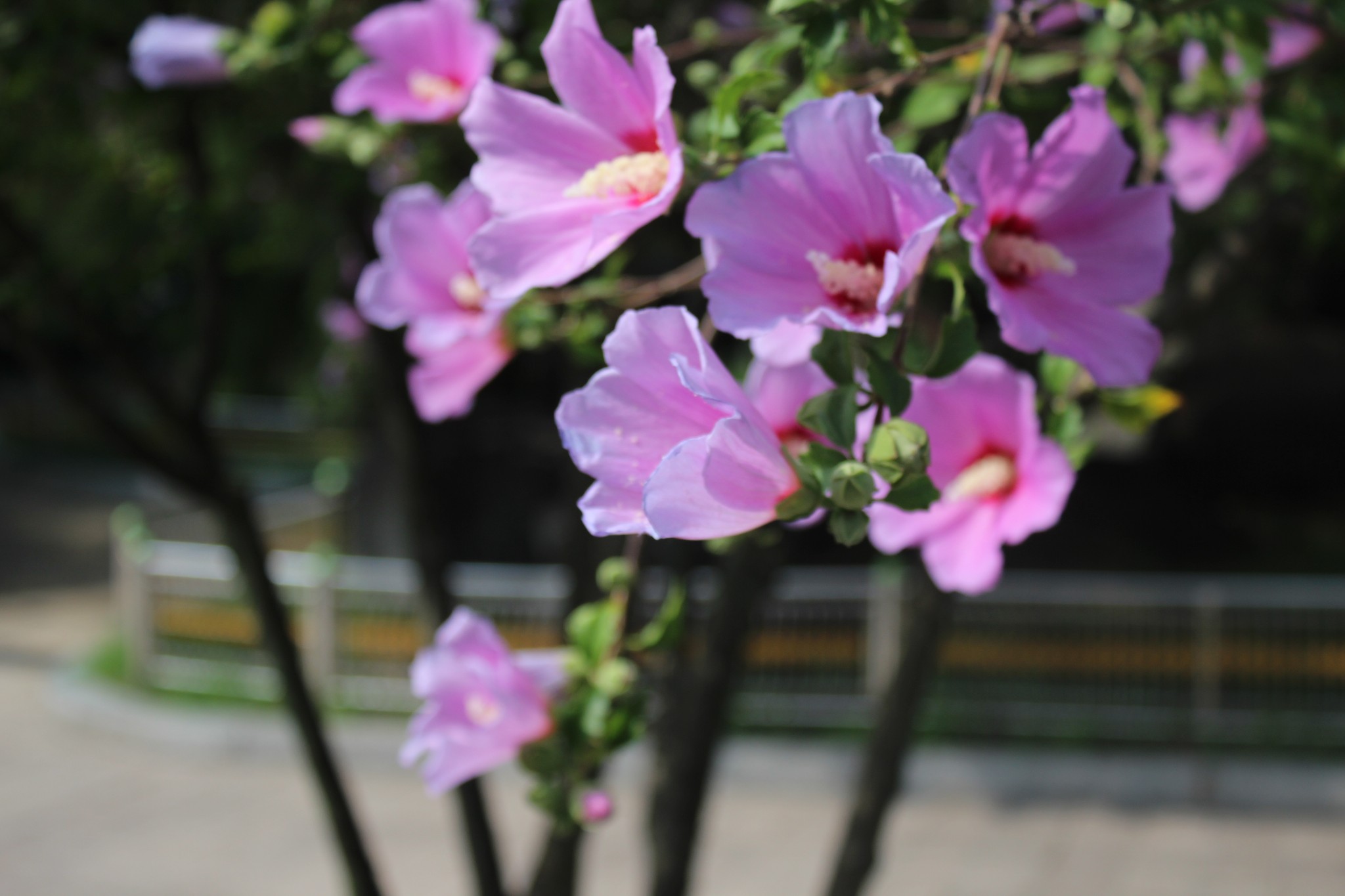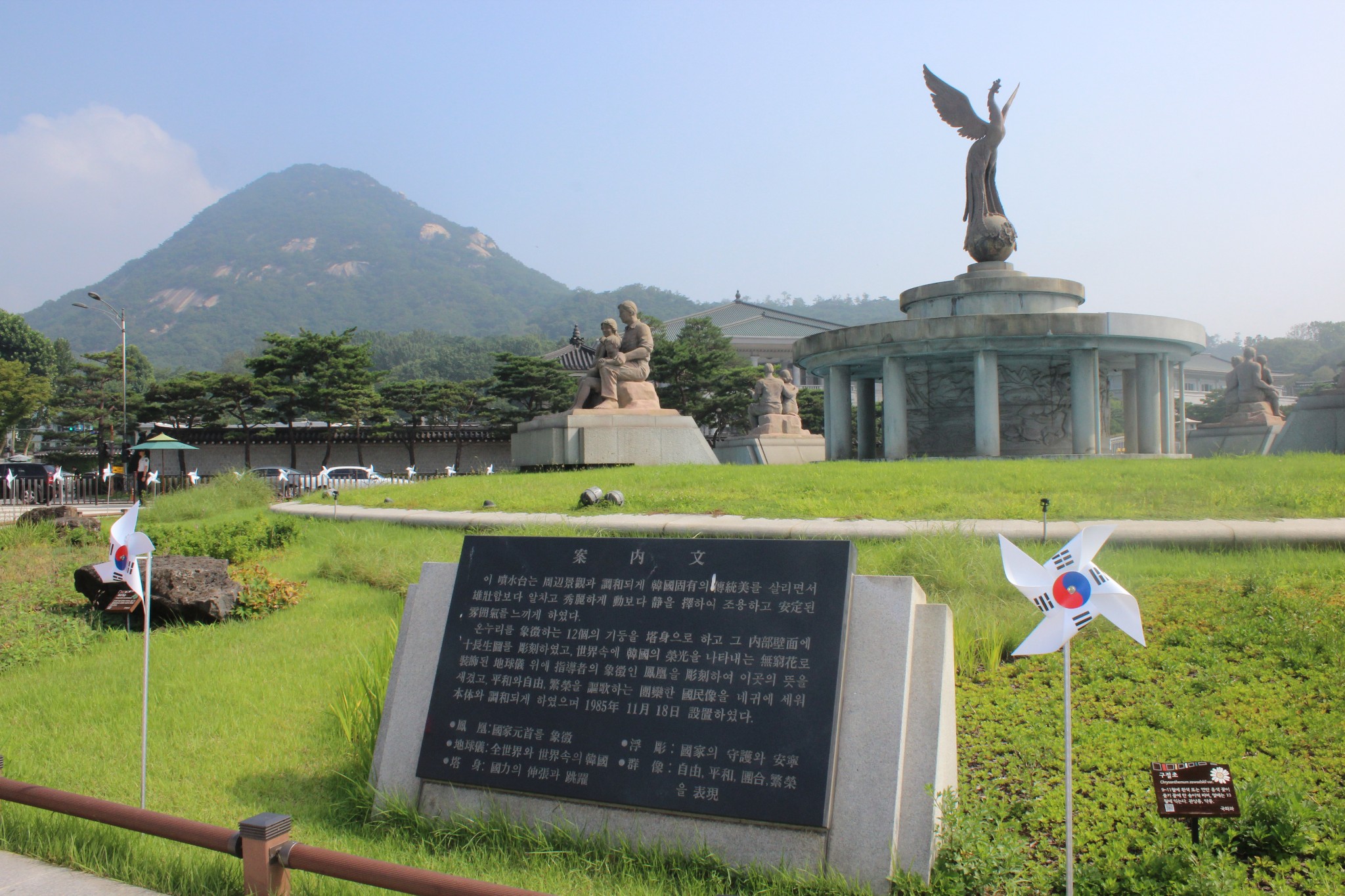 广场附近开满了木槿花,金导说这是韩国的国花,因为它的生命力很顽强。在和平广场可以远眺后面的山,金导说那是韩国的龙脉所在,因为那个山看起来像个龙头,然后之前朝鲜还派人偷偷潜上去炸——(⊙o⊙)…广场中间是凤凰雕塑,是韩国有身份的象征。