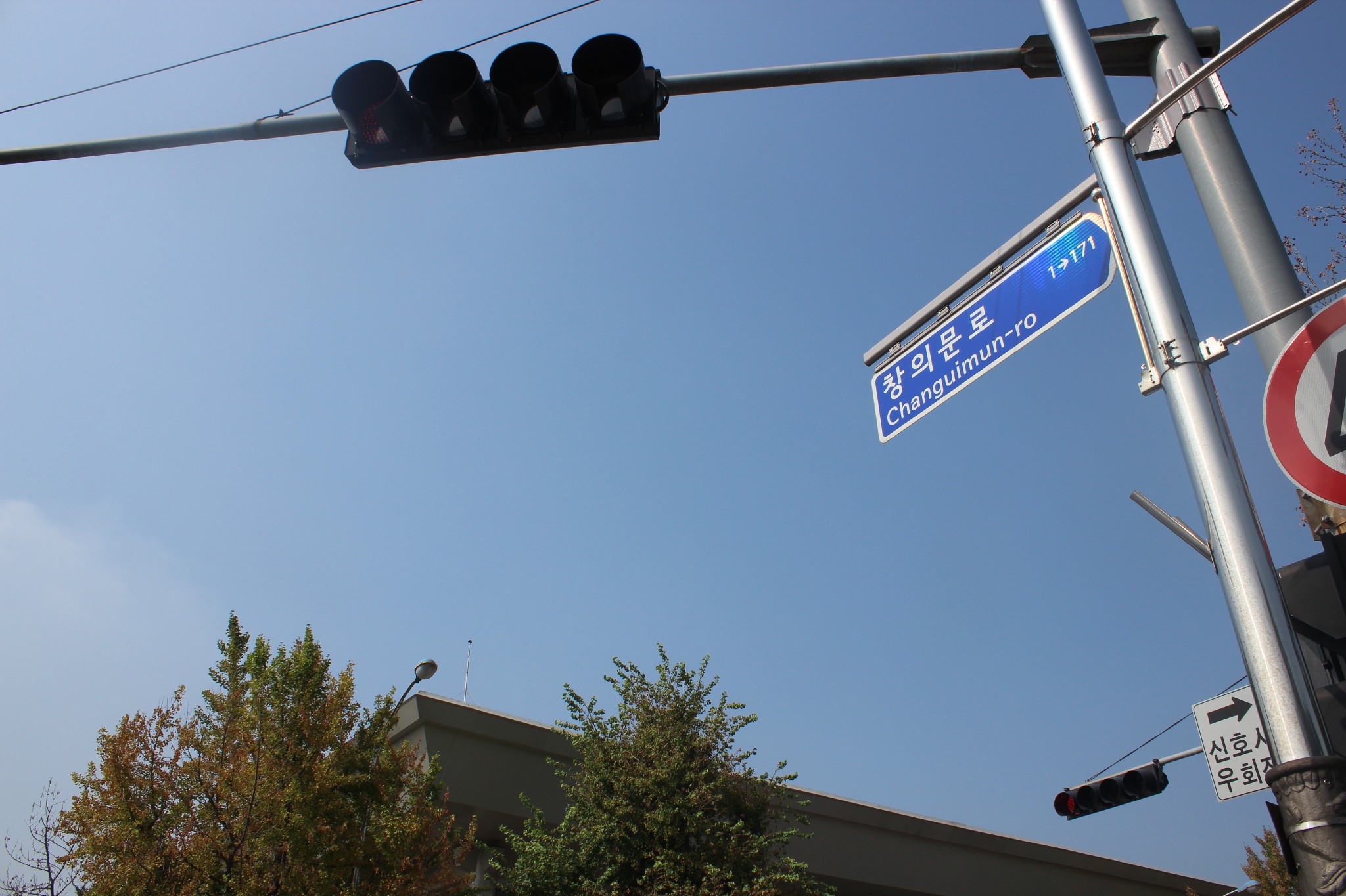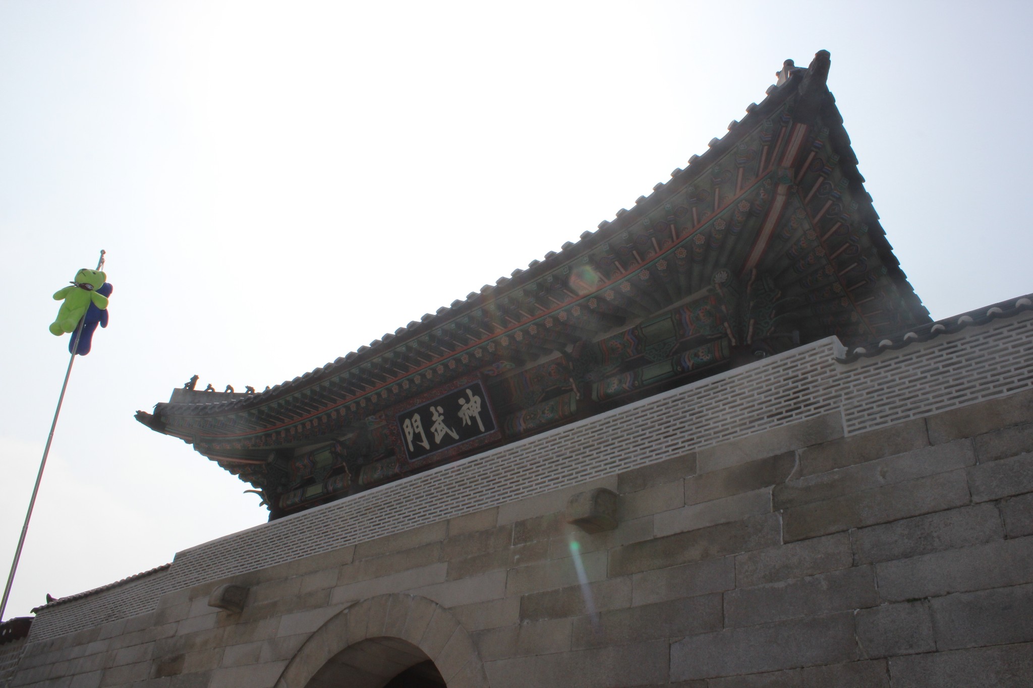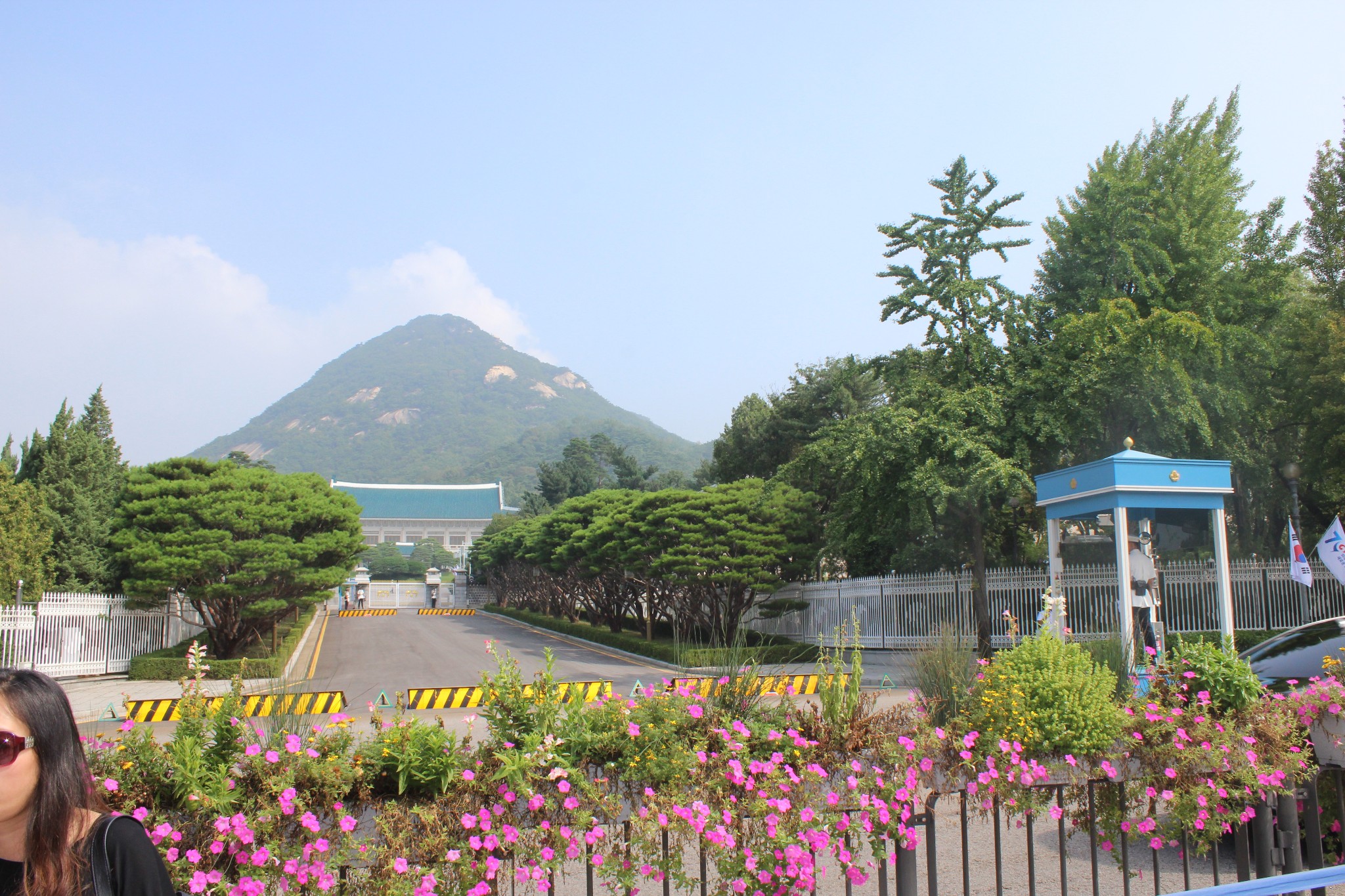 从和平广场往右走不远,沿着景福宫的老城墙走到神武门,就是景福宫的后门了,然后金导说正对着的那边有个青色屋顶的房子就是青瓦台,朴槿惠总统就在那里办公。